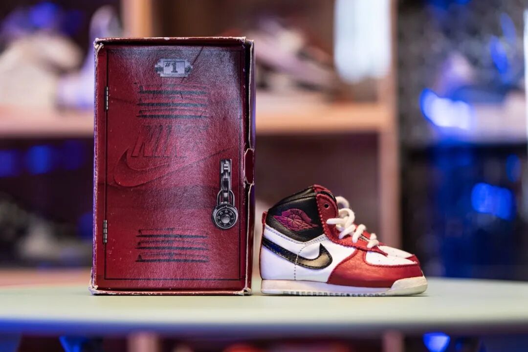 如今元年 Jordan 鞋款的市场价格想必大家也都有所了解,尤其是元年 Air Jordan 1,但大家也千万不要因为童鞋的体积小以及其他因素而忽略它。湿远分享到:这双蓝色桃心版本的童款,他在日本拍卖网站跟其他竞拍者大战多个回合,最终以1.7万人民币的价格得标。看到这里大家可能与笔者当初的反应是一样的:一双童鞋竟然能这么贵?