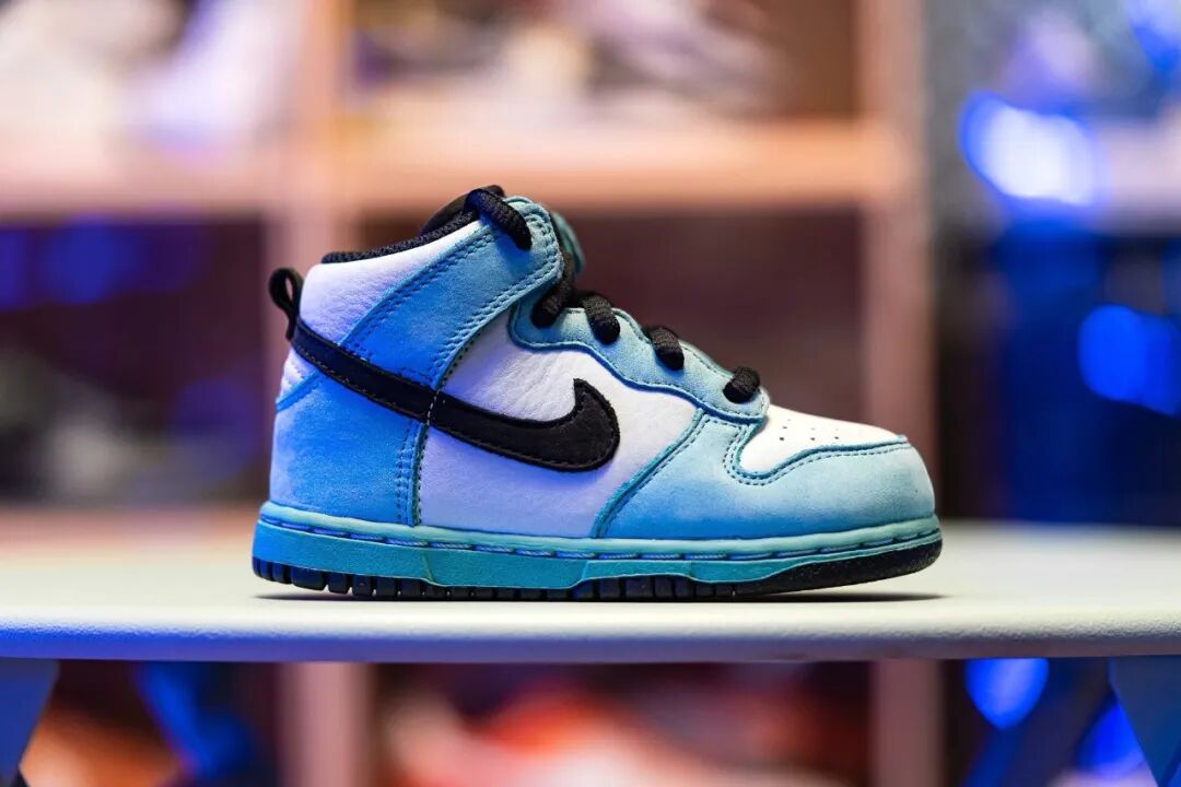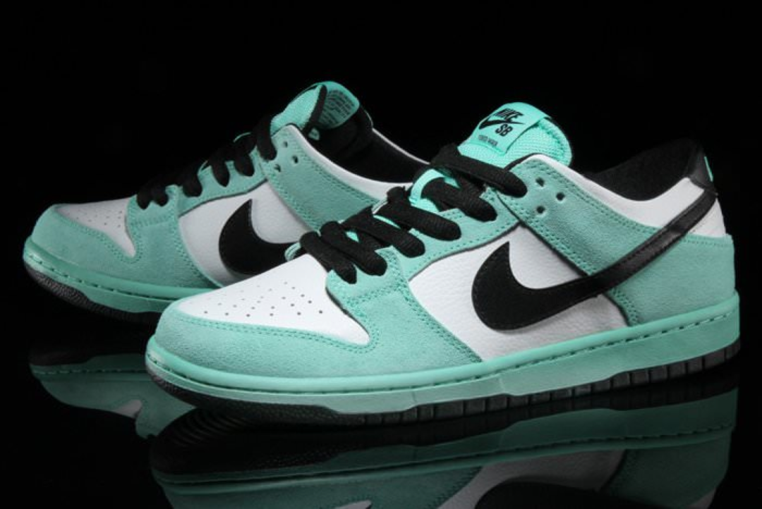 国内玩家习惯称这一配色为"冰蓝",同时它也是 Dunk SB 非联名系列中的经典配色,最早发售于包装还是银盒的2004年 (左图)。2016 年 Nike SB 又将这抹蓝以低帮的形式呈现 (右图)。
