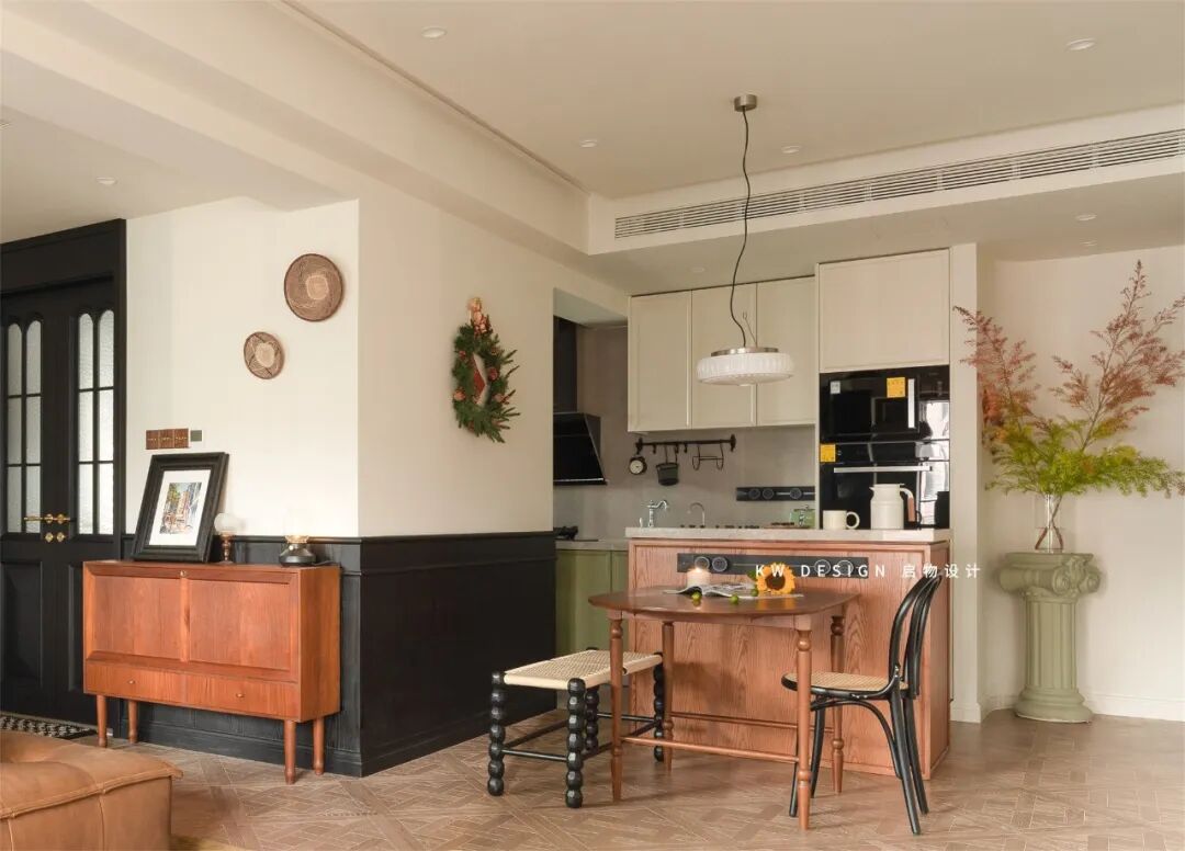 近乎正方形的餐厅空间,两边预留动线,活动餐桌连接固定餐岛台打造围合餐厨区。无论是轻食简餐,还是午后休闲夜晚小酌,还是多人聚会的备餐操作皆可轻松实现,空间利用率满满。