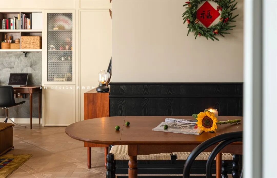 黑色水曲柳护墙板连接过渡至公卫主卧,过道转角处立一只古朴斗柜收纳物件同时作展示台,墙面装饰屋主海淘的汤加草编盘。
