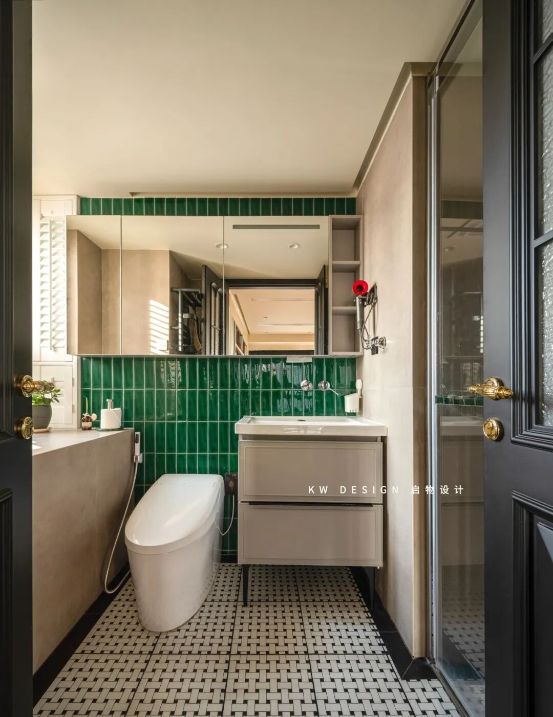 流畅的弧形拱门搭配压纹玻璃装饰私密空间,充满质感的黄铜拉手点缀黑色立面,构建出怀旧浪漫韵味。
