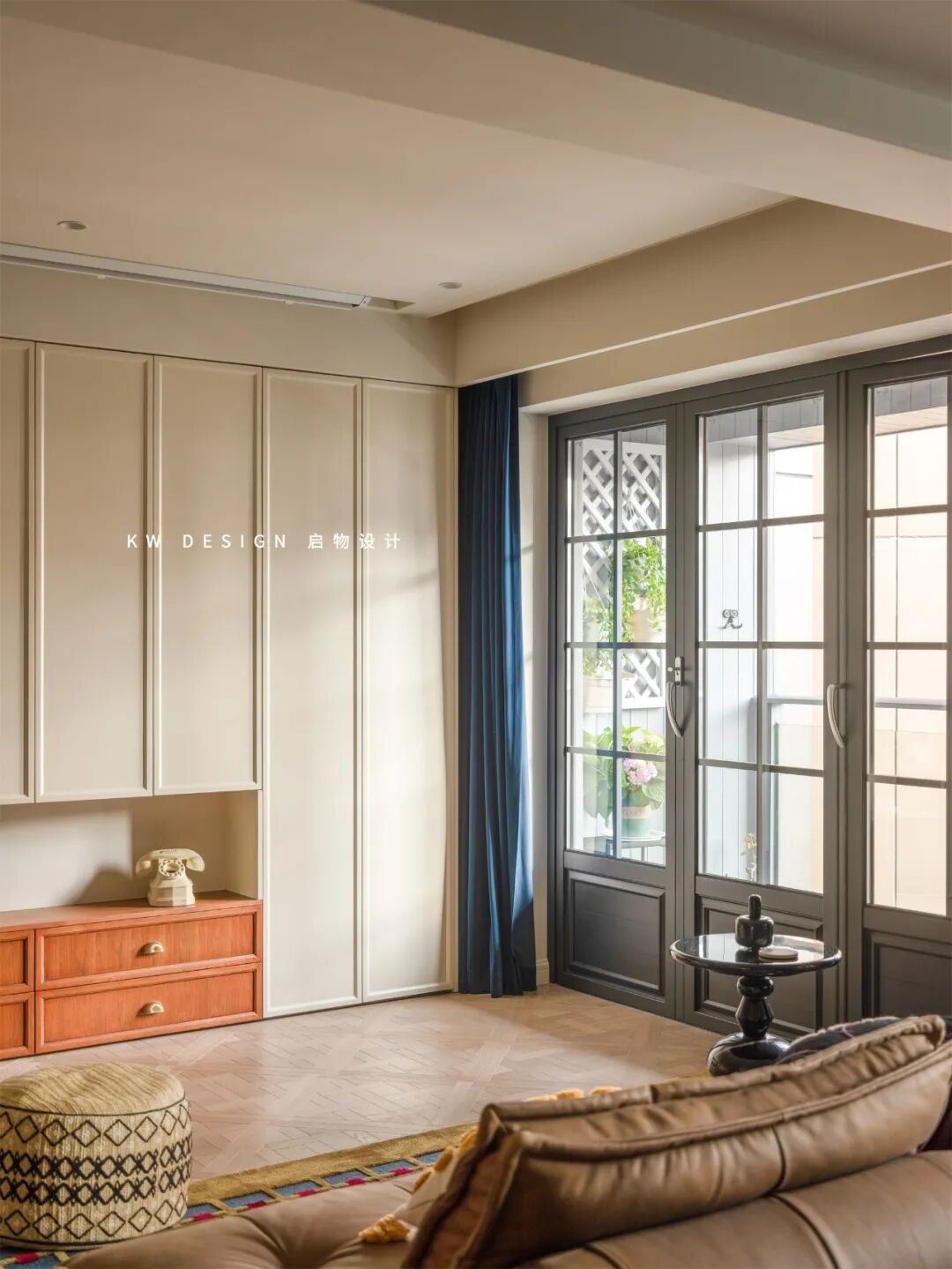 由收纳柜体代替装饰与空间分隔,空间释放实用功能和动线。转角半高柜子弱化生硬转角,增加叠放收拾的操作平台,摆件与植栽又可添一处过渡端景。