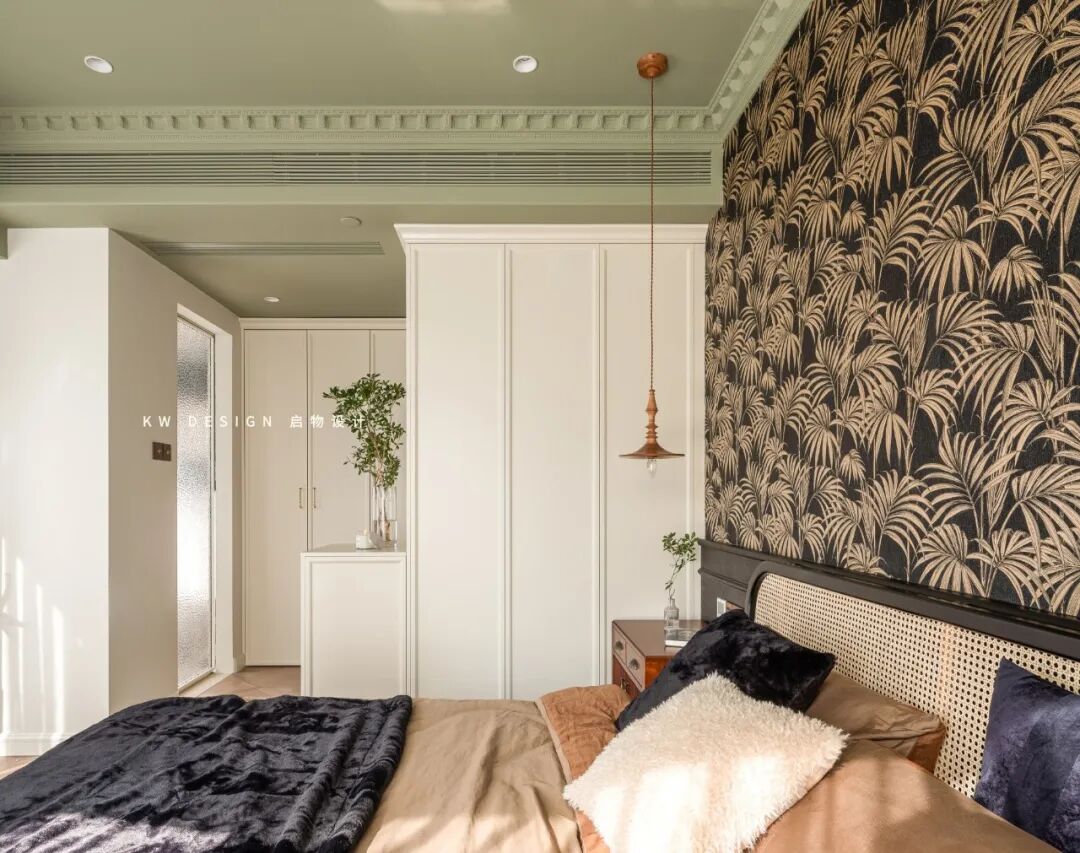 睡眠空间用色更加跳脱大胆,南洋风不可缺少的清凉与热烈由墙至顶大面积渲染,床头背景采用黑白相间的棕榈叶装饰壁纸,抹茶绿铺陈天花,具象的绿意与梦幻的香薰装点其中,为空间注入大自然的生机以及探索的神秘感。