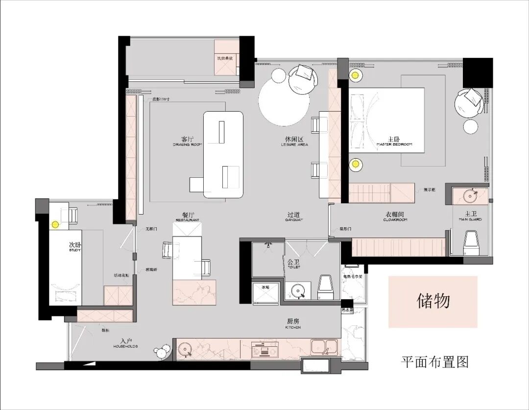 3. 每个空间沿墙独立设置兼具实用与展示收纳区,功能家具居中摆放释放灵活的洄游动线空间。