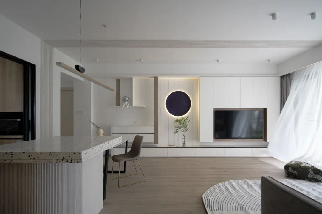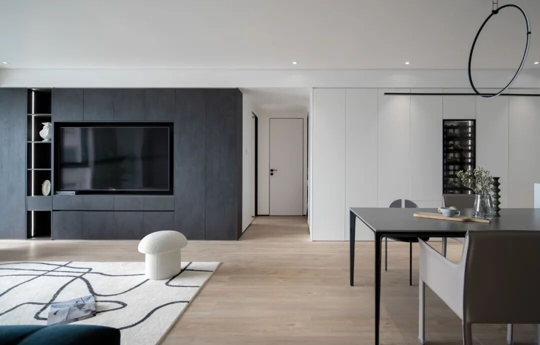 遵从纯粹至简,全屋无主灯设计,无框预埋、无垭口、无门窗套、无踢脚、无收口边。墙顶通刷自然肌理的微水泥,以圆弧结构串联过渡,搭配适度的柜体收纳,减轻空间负担的同时,依然保有美学和实用性。