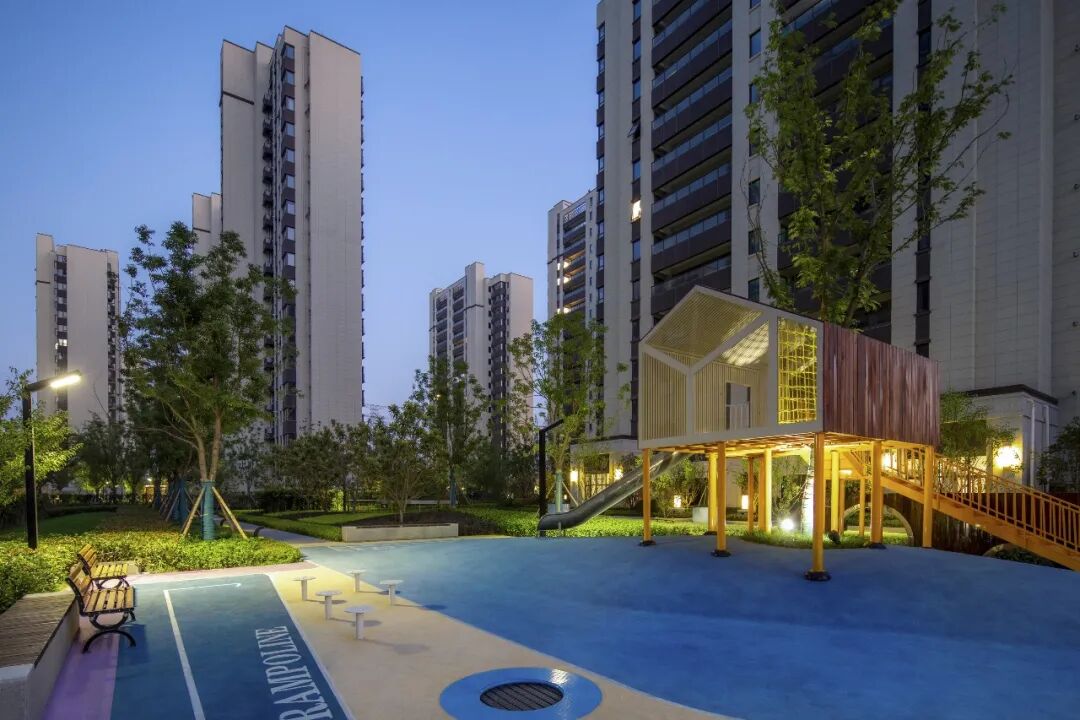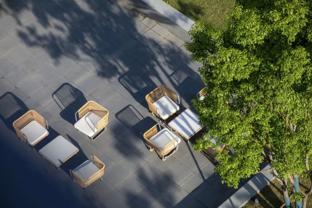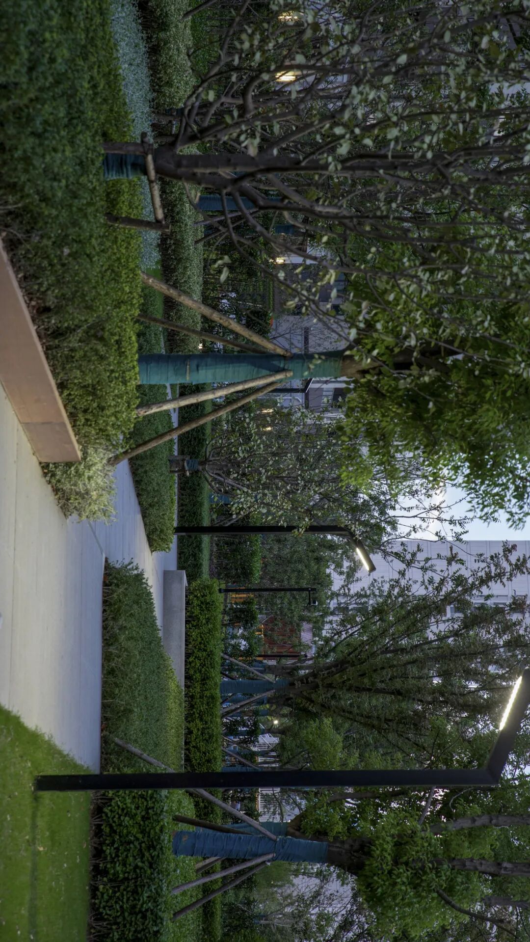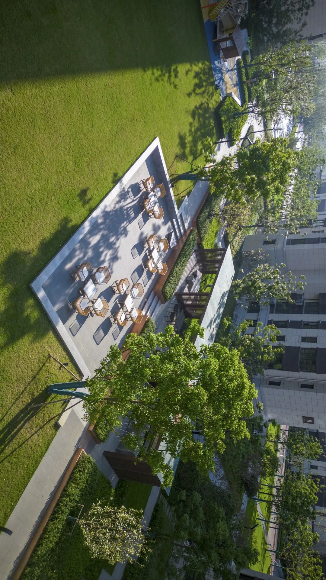 景观会客厅是户外核心的交互场所。于构筑物旁营造下沉休闲空间,丰富场地竖向体验感。或静坐读书,或交流畅谈,享受树木摇曳、光影变幻,体会轻美生活氛围。