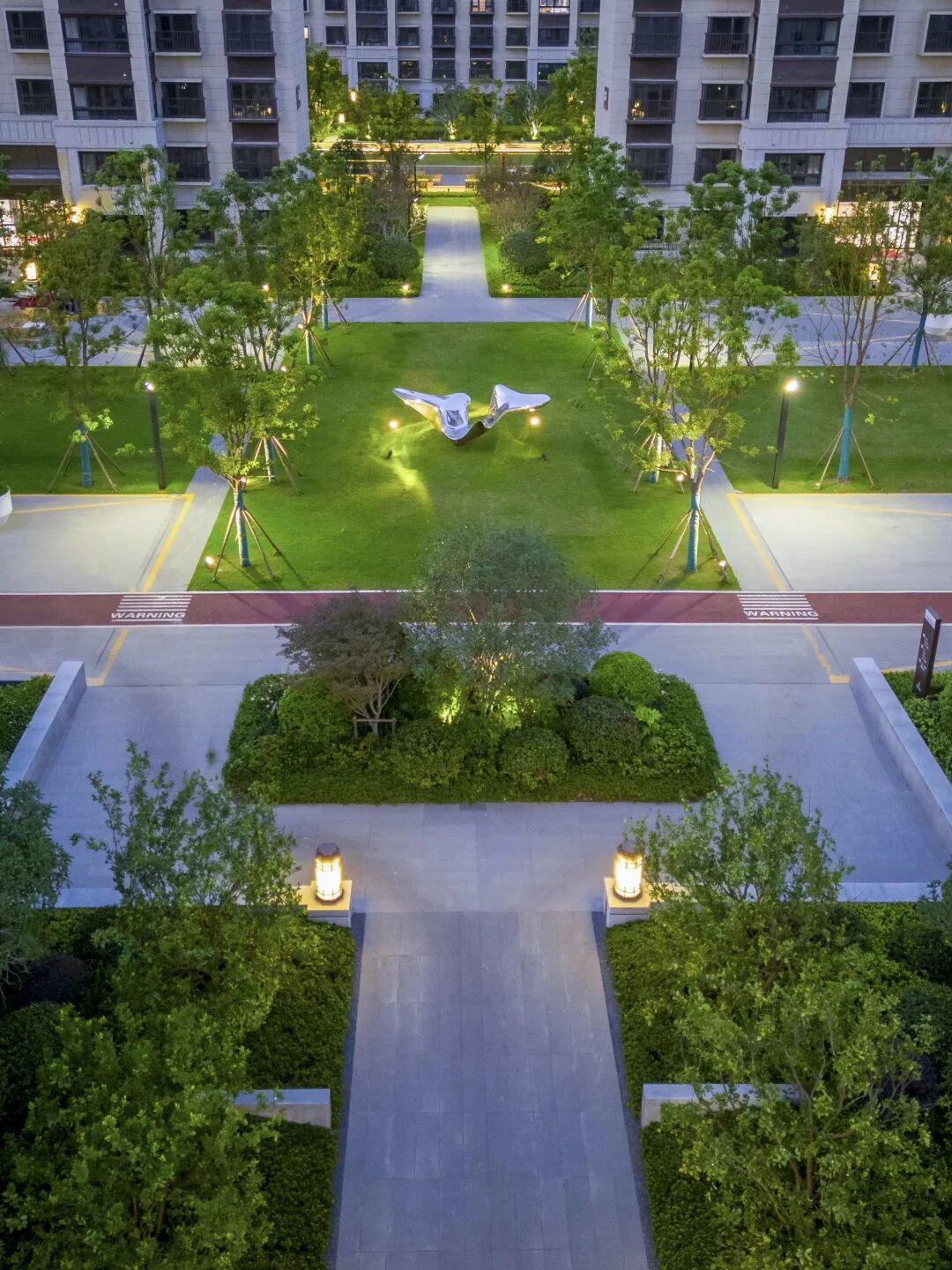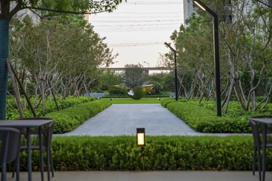 清风拂草涧,翠色生两边,叹二进自然之乐。对称式主轴草坪中央落座迎宾雕塑,将仪式感悄然融入疏阔的绿意中,唤醒都市人回归自然的渴望。