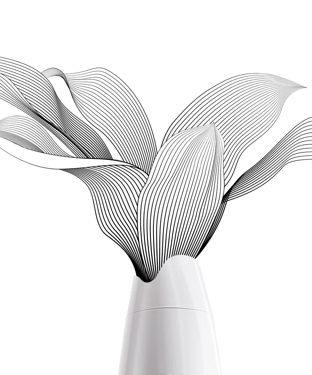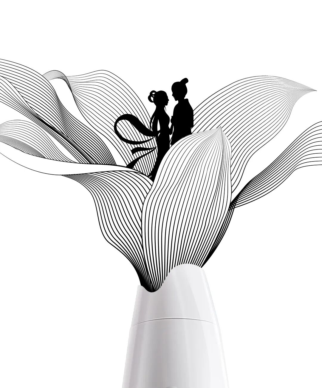 最后再来看看电吹风与花能否擦出火花,盛开的玫瑰花里藏着一个电吹风?有点生硬;电吹风风吹出一朵玫瑰花?然后花瓣用线条密集的线条展示,好像风一样,花蕊则变成牛郎织女。感觉还好,但是玫瑰花的花型偏向矮胖、圆润,从电吹风里吹出来的感觉并不太合适,如果花是发散的形状效果会更好。