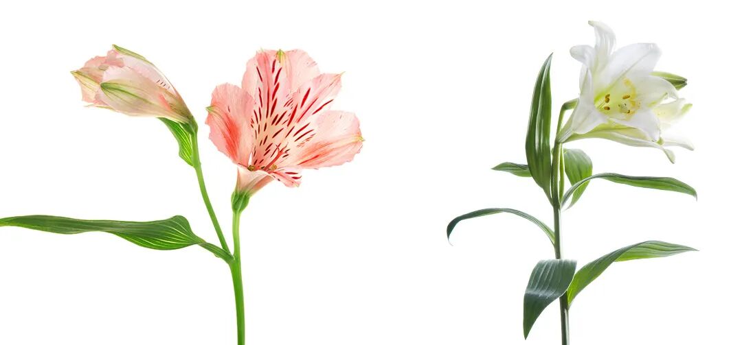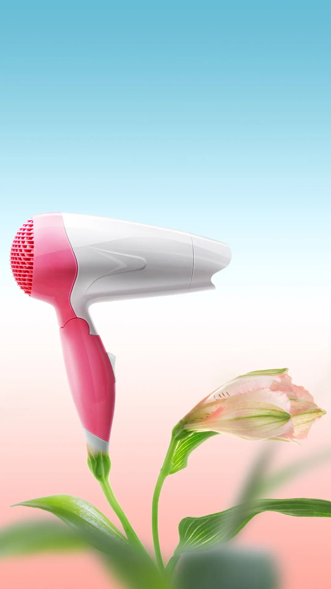 02.该图片中有两朵花,我们要把其中一朵置换成电吹风,替换大的还是小的呢?通过尝试我发现替换大的会更合适一些,因为如果替换小的保留大的,那么大的花会很抢眼,而且不利于构图;而替换大的保留小的,这朵小的百合花跟电吹风的外形更接近,可以起到呼应的作用,于是我做了简单的合成得到如下效果: