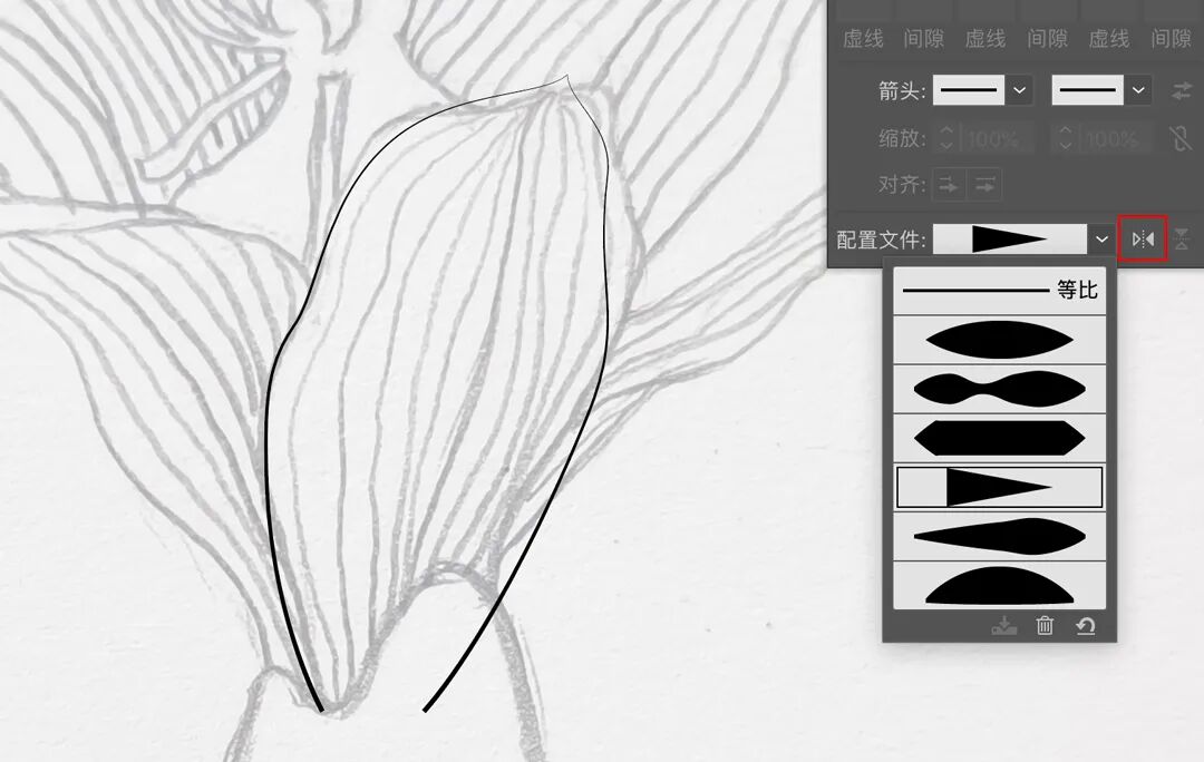 02.在描边面板里把线条的形态改为上细下出,右边的镜像符号可以改变粗线渐变的方向。