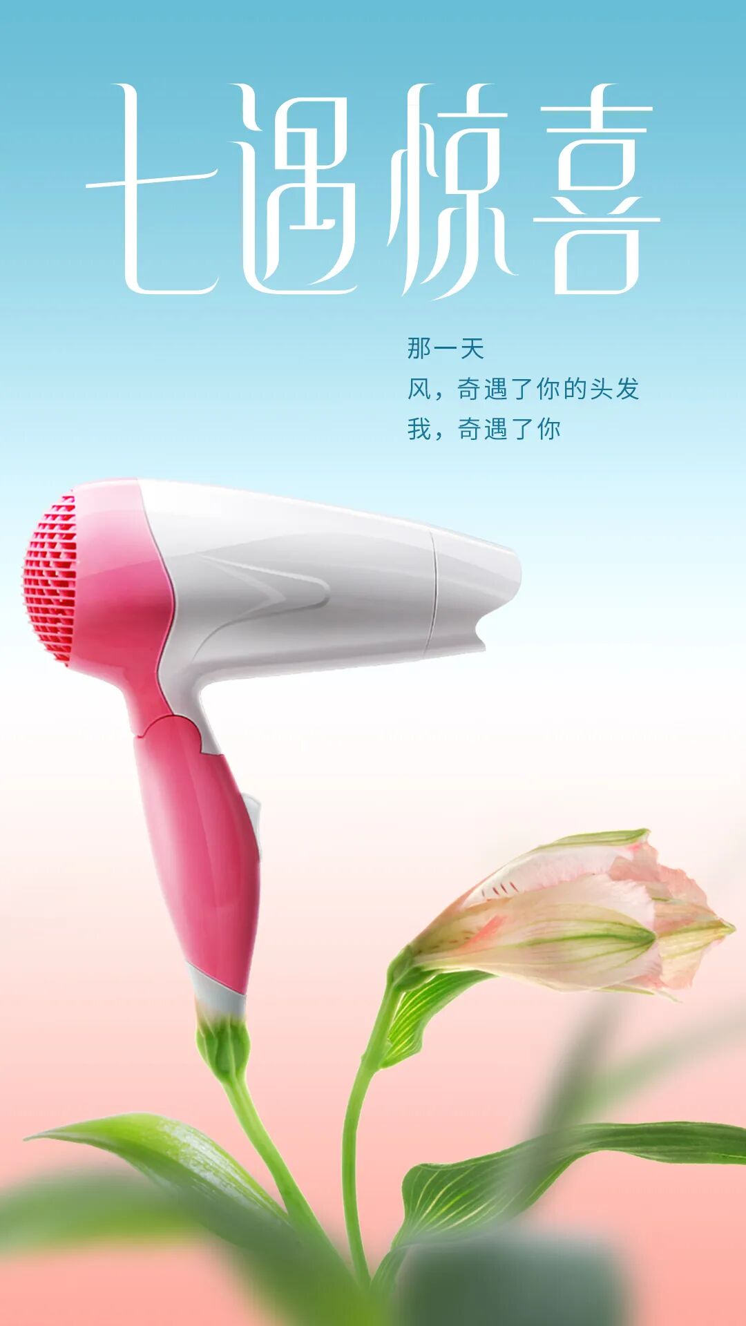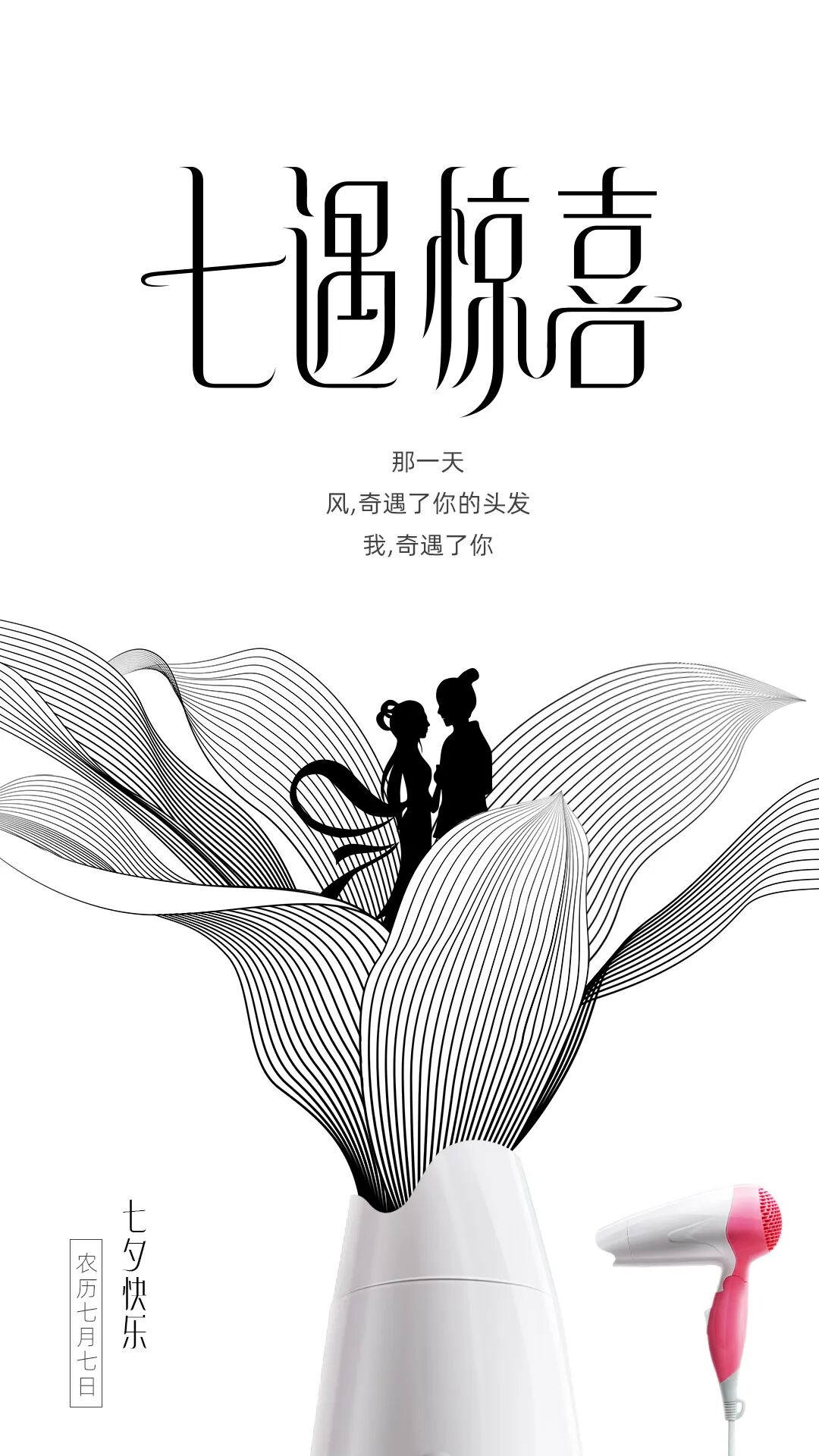 再来看看电吹风与牛郎织女、鹊桥的组合,从电吹风里吹出鹊桥,牛郎织女在桥上约会?普通了一点,而且构图很难好看;牛郎织女把电吹风比作鹊桥?还行,但这种创意也挺常见的;用插画展现牛郎用电吹风给织女吹头发的场景?有点意思,但是插画类的七夕海报实在太多,如果插画水平一般,很难出众,像葱爷这种手绘渣渣就不凑这个热闹了。