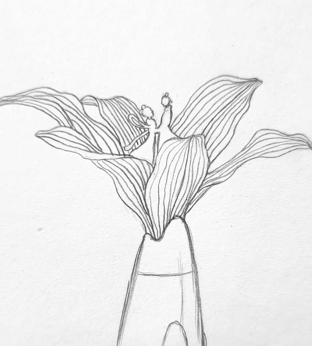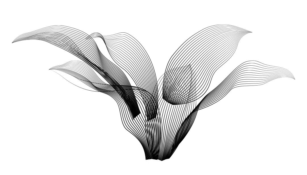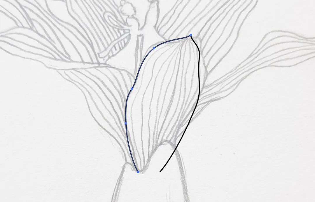 01.首先来画第一片花瓣,根据草图画出花瓣的左右两条轮廓线,注意,线条的顶端并不是相连的,另外,线条的形态可以稍作更改,不一定跟草图一样,流畅一点更有风吹出来的感觉。