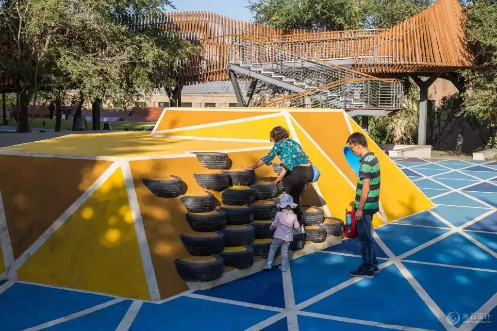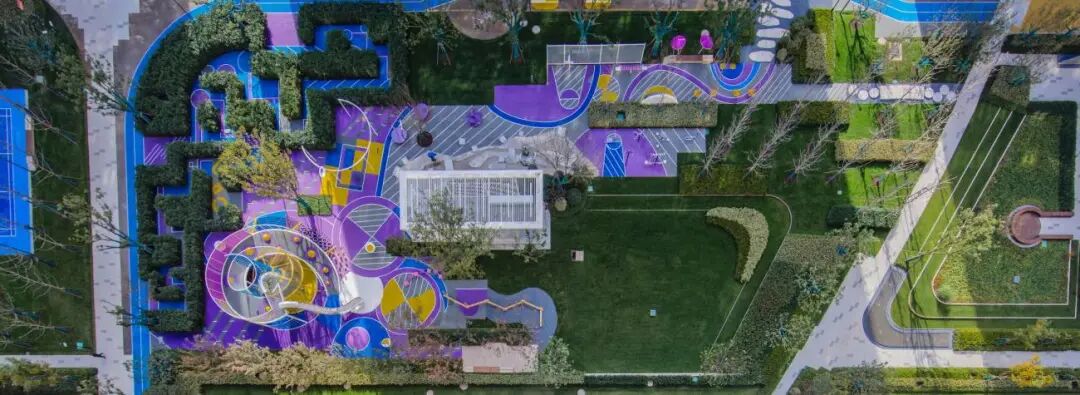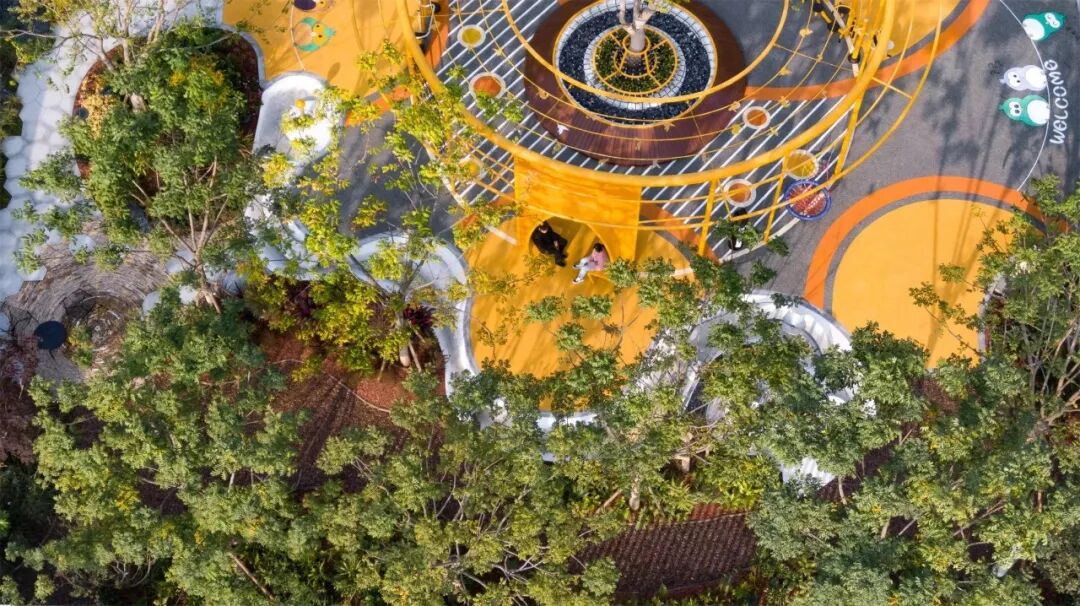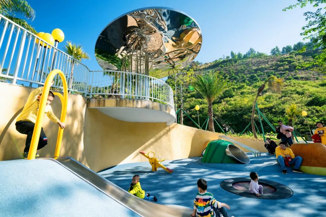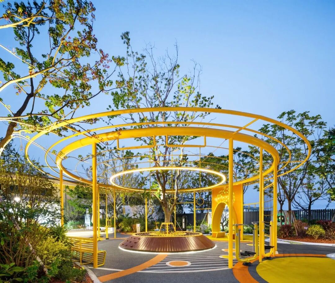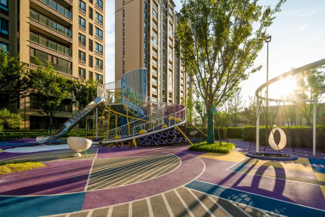 滑梯、秋千、攀爬架…这是一个色彩缤纷的全龄活动乐园,基础的游乐设施和休息处.