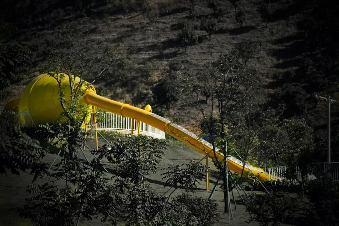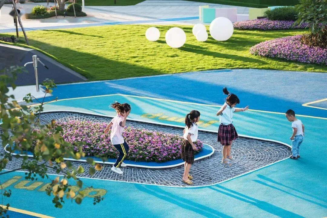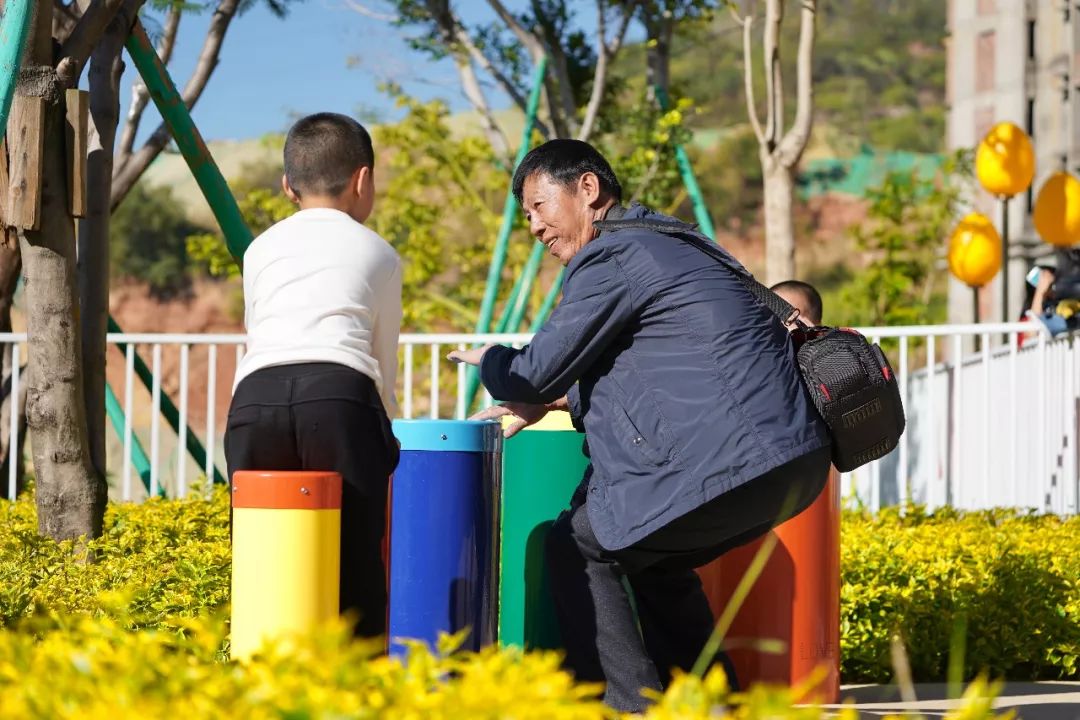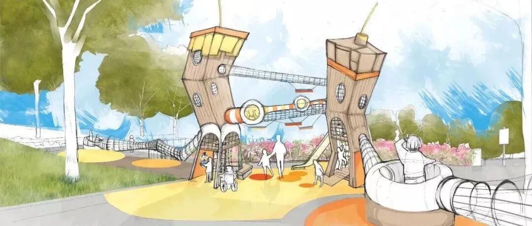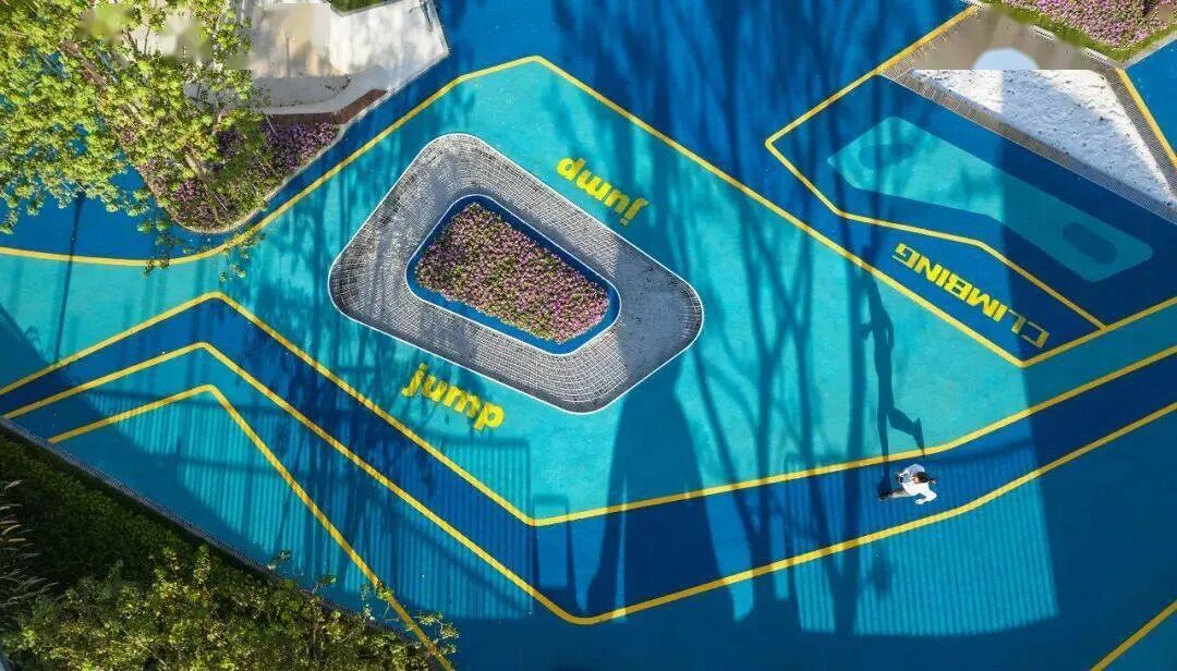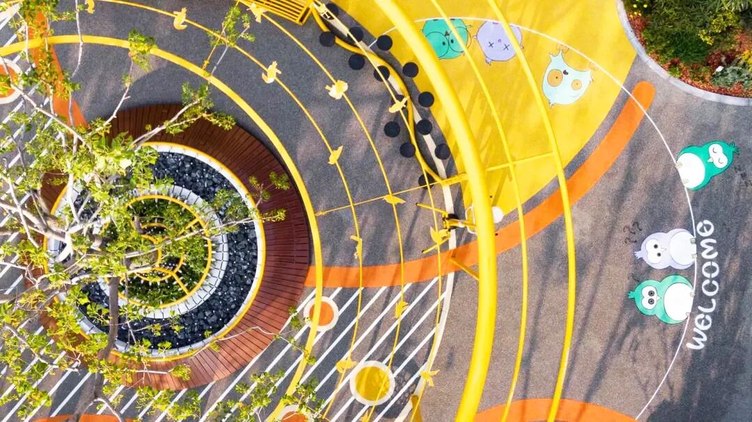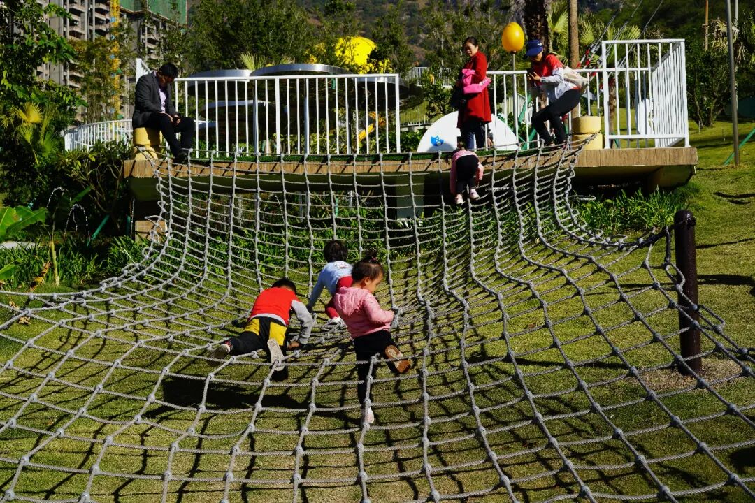 滑梯、秋千、攀爬架…这是一个色彩缤纷的全龄活动乐园,基础的游乐设施和休息处.