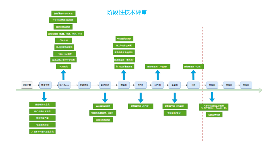 下面通过几个相关制度或者流程建设的例子来具体说明。其一,我们规划了一些对应不同项目阶段的技术评审。进行技术评审是为了提前发现风险、发现问题。比如第一次封闭测试,就要做客户端性能、兼容性或者其他测试。有一定用户量后,也会有对应的技术评审、服务器压力测试等工作。每个项目阶段我们都会开展技术评审,以管控技术方面的风险。