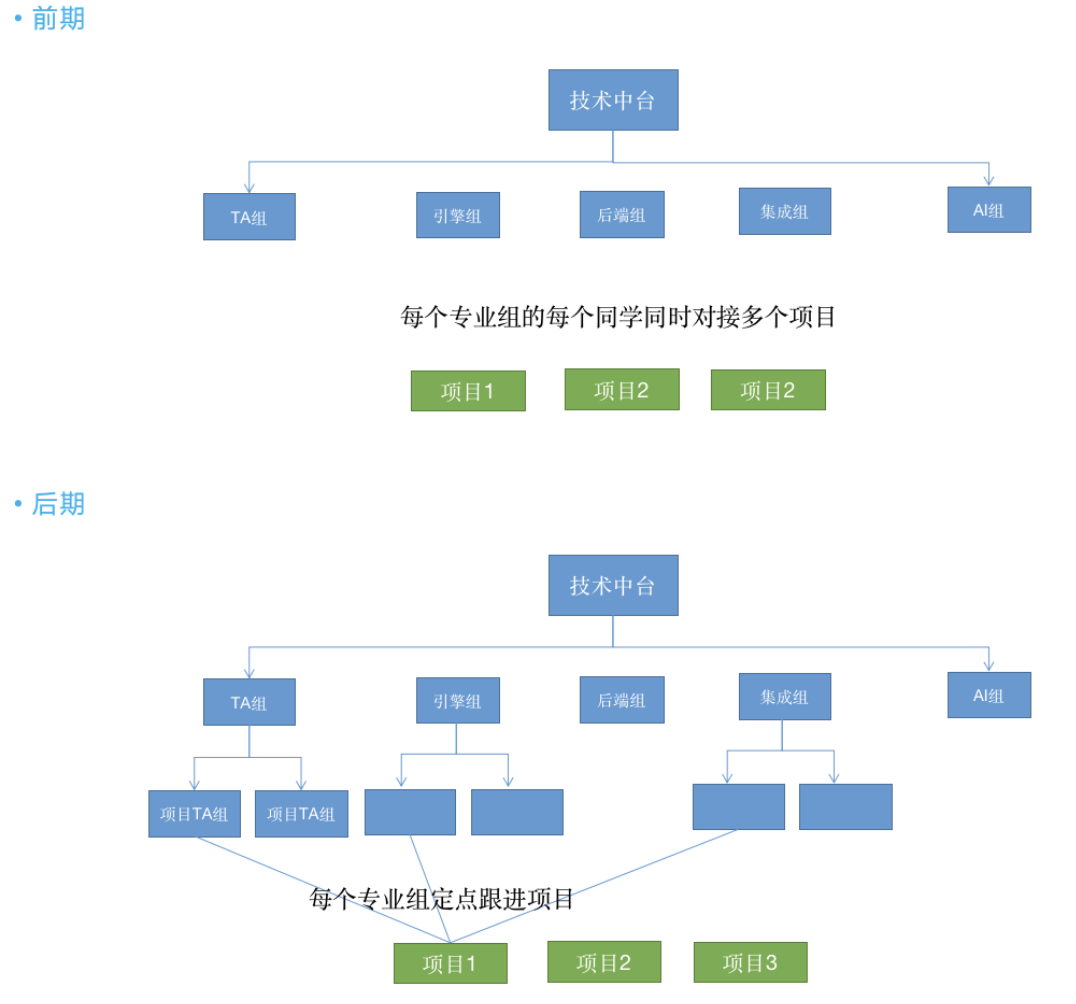 由于在中台搭建早期,TA、引擎这些岗位其实专家并不多,人数有限,又要服务多个项目,所以主要是按专业细分来内部分工。