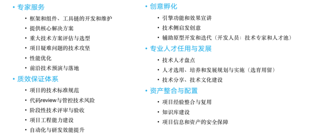 我们对(技术)中台部门的职责做了一个梳理,总共分为专家服务、质效保证体系、创意孵化、专业人才任用与发展、资产整合与配置五个部分(详见下图)。