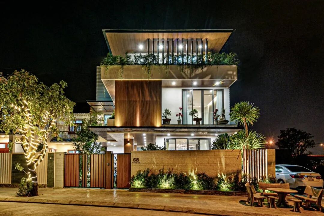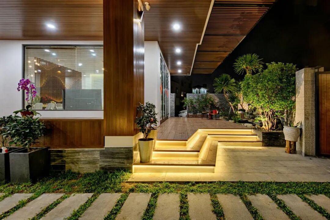 家里入户就是个大的庭院,有草地汀步,有各种绿植,门口位置进行抬高设计,楼梯踏步安装灯带,防止不小心绊倒。