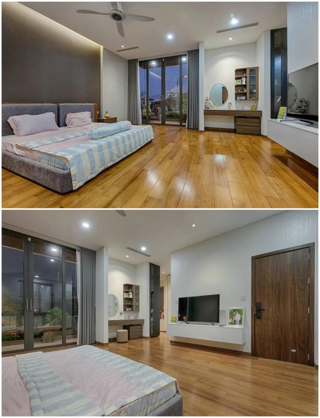 主卧空间大,中间腾出来的过道空间能满足女业主平时练瑜伽的喜好,窗边是梳妆台设计,另一边就是衣帽间,整体动线很合理。