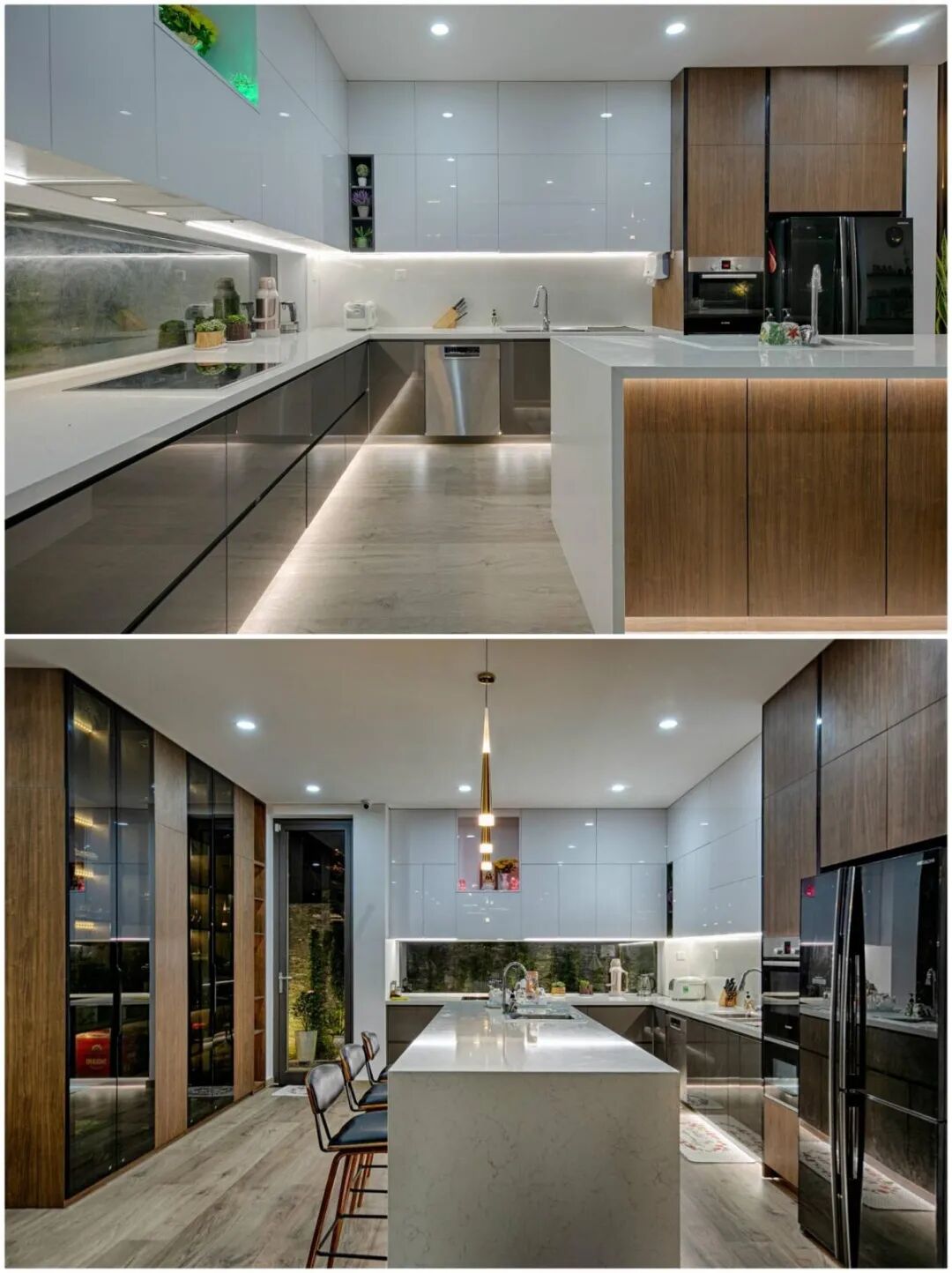 一家人住在一起,厨房空间一定得大,L型橱柜+电视高柜+岛台设计,空间宽敞,可以容纳好几个人一起做饭。收纳空间和台面都很充足,吊柜和地柜下面全都隐藏了灯带,整个空间无照明死角,双水槽的设计,也能实现中西双厨的设计,满足一家人不同的烹饪需求。