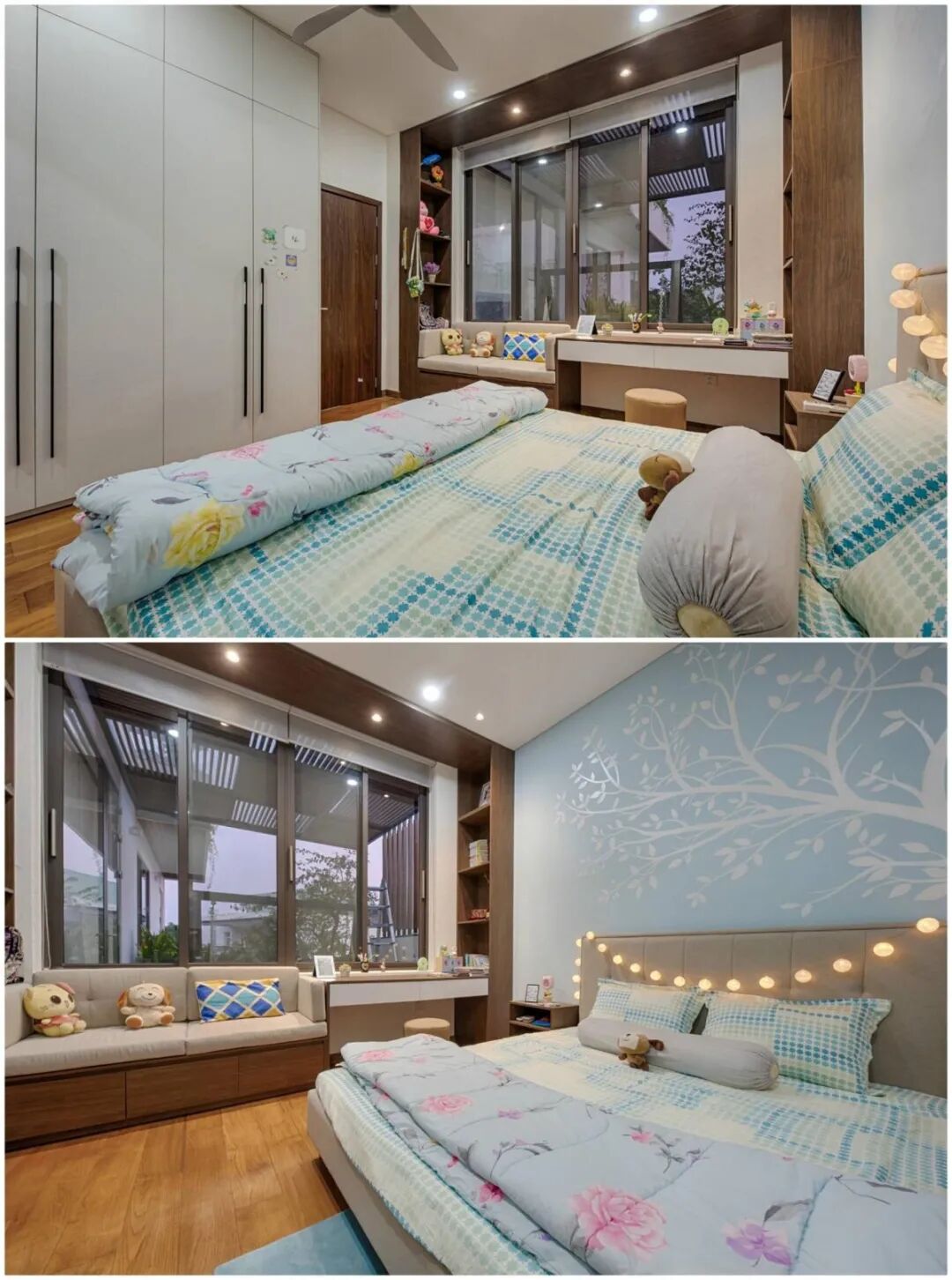 孩子房间里床头挂满小彩灯,床尾是到顶的大衣柜,最亮眼的则是窗边的书桌+沙发+书架一体式设计,一边学习,一边休闲,两边墙壁设计成开放式储物架,收纳书籍或者玩偶都可以。