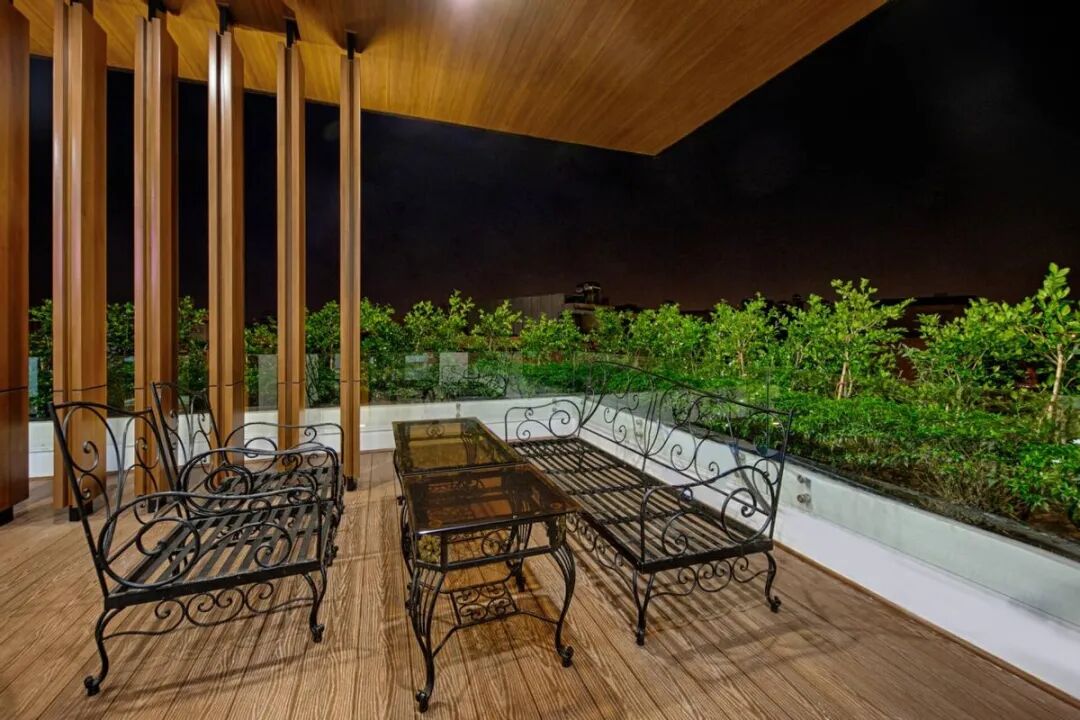 顶楼还有个露台,上面准备了长椅和长桌,周边护栏外面全种满绿植,景色宜人,一家人也可以选择在这个地方坐下聊聊天。