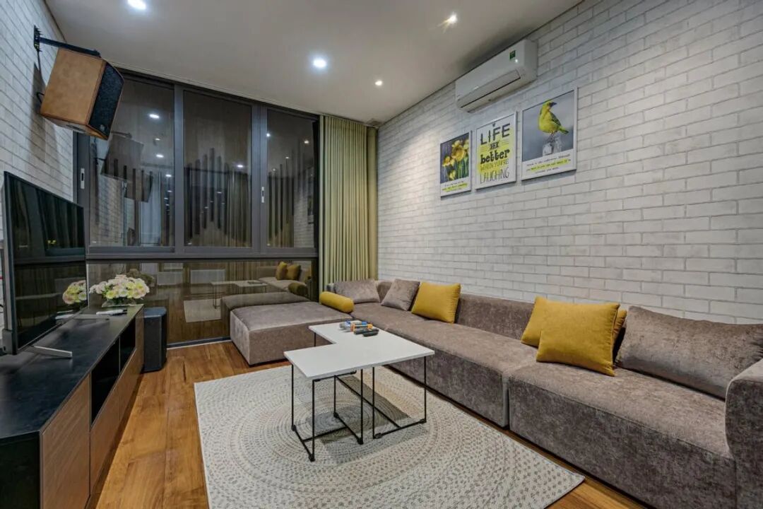 家里每一层都有独立的小客厅,可以方便看书,喝茶,不用下楼,平时也能招待自己的朋友,互不干扰。浅绿色的沙发背靠玻璃护栏,对面还有电视柜,功能应有尽有。