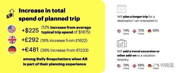 "对于旅游,当AR成为旅行计划旅程的一部分时,Snapchat用户预计会比他们通常花费更多。这是因为AR可以帮助他们更有信心地对旅行做出决定,并最终通过在行程中增加旅行游览项目或其他附加项目来规划更长的旅行。"