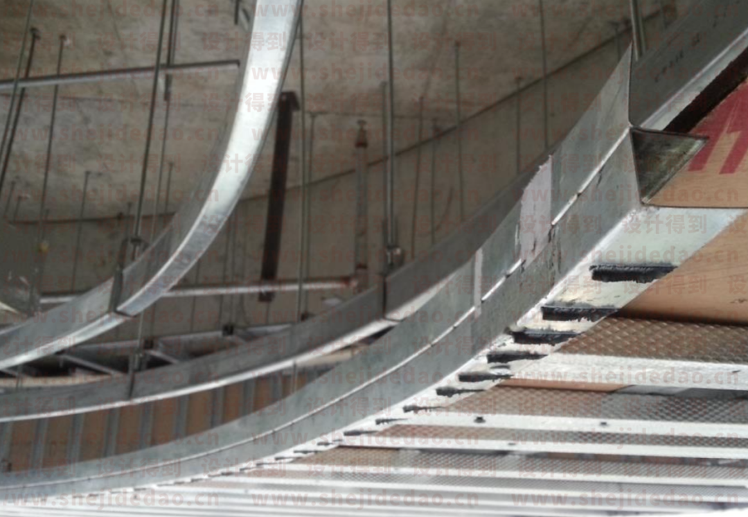通过这些节点和现场图片的分析,咱们不难看出,全龙骨构造本质上跟传统的木挂板跌级形式原理类似。通过各种规格和卡扣的轻钢龙骨来进行一定的搭接和编制,来代替掉木挂板的作用。