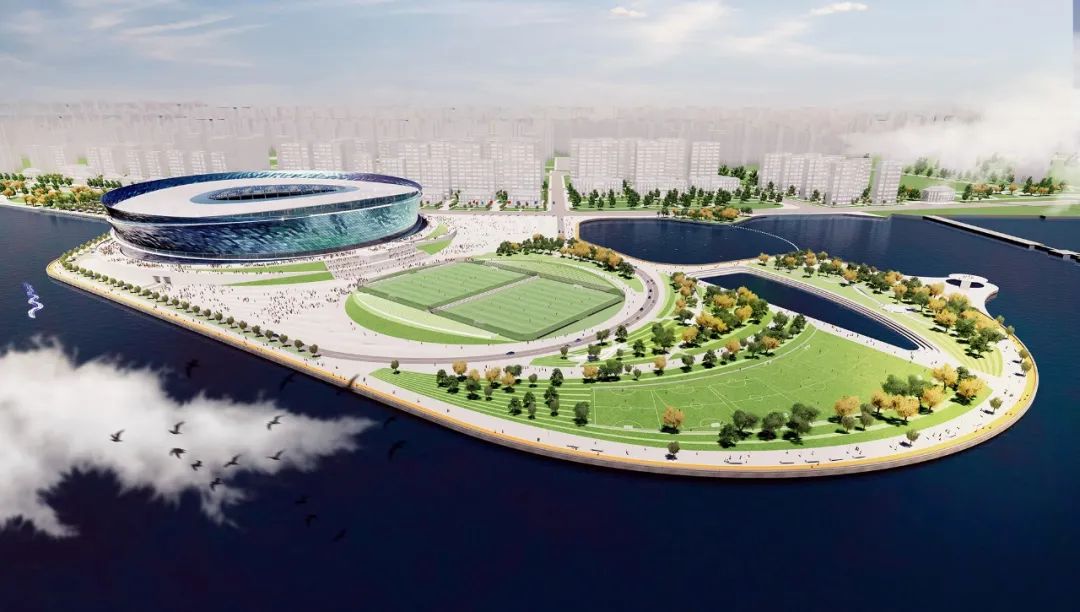 大连梭鱼湾足球场总建筑面积13.6万平方米,共有6.3万席位,是FIFA标准足球场,曾入选亚洲杯举办地。足球场三面环水,依海而建,有着270°的海岸线视野,位置极佳。目前该项目已完成草坪铺装和看台座椅安装,预计于2023年竣工并投入使用。