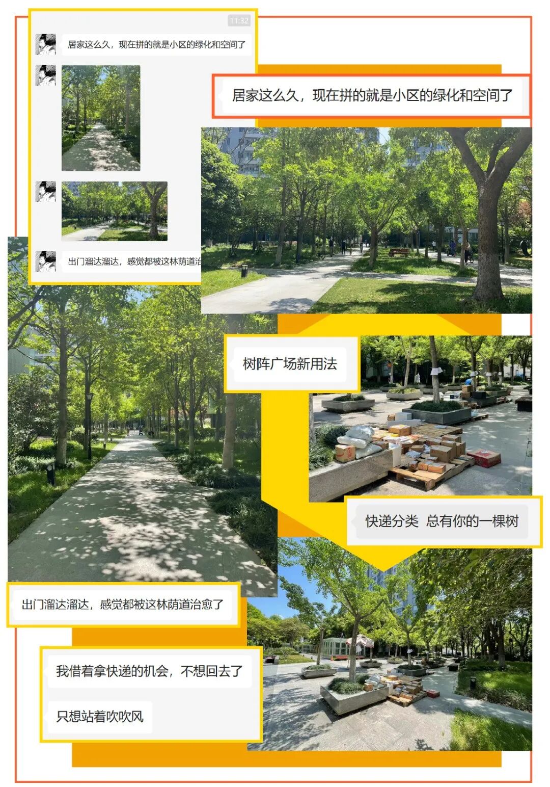 的确,对于居住地在上海封控区,实行“区域封闭、足不出户、服务上门”政策的小区居民,在长达一个月的时间,活动范围可能就只是自己的楼栋。居住的社区配套不同决定了在封城期间的居家生活体验千差万别。景观资源比较丰富的小区,下楼做个核酸,拿个快递,体验感都更美好些,而在一些小社区里,既没有绿化景观,也没有休闲娱乐的场所,除了看看窗外发发呆,隔离在家一整个月真的就没别的消遣了,住在不同景观品质小区的隔离生活,这其中的体验感都是千差万别的。