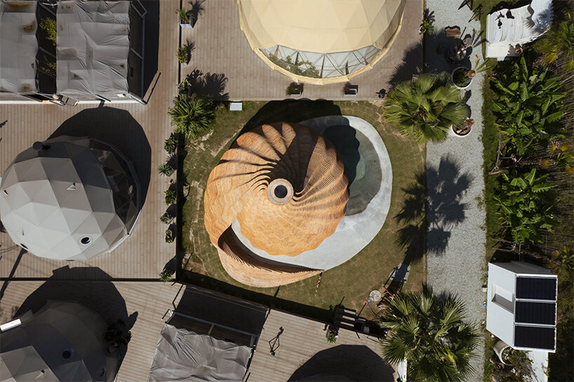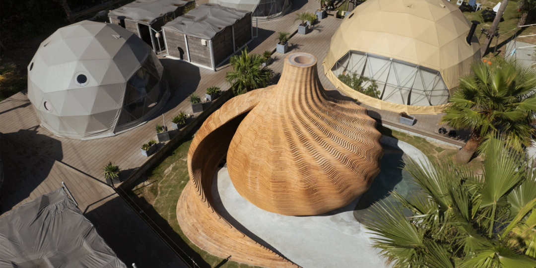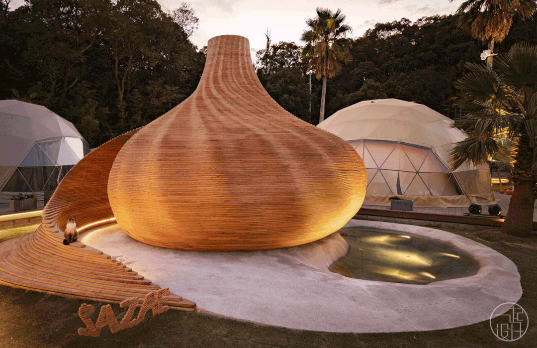隈研吾建筑事务所在日本直岛的 SANA MANE 豪华露营村完成了一座以贝壳为设计灵感的“SAZAE”桑拿房,于2022年9月正式向度假村客人开放。
