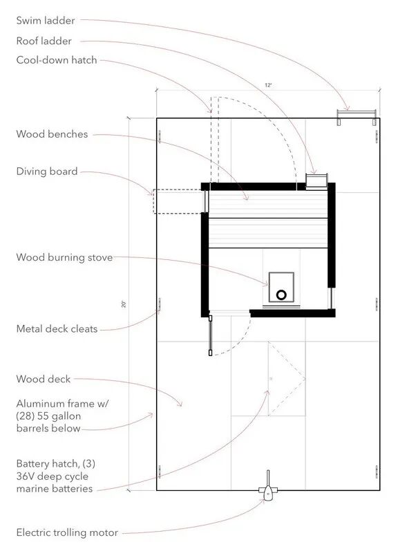 桑拿房是一艘注册船只,由带有 (3) 12 伏电池的电动拖钓电机提供动力,室内由燃木炉进行加热。