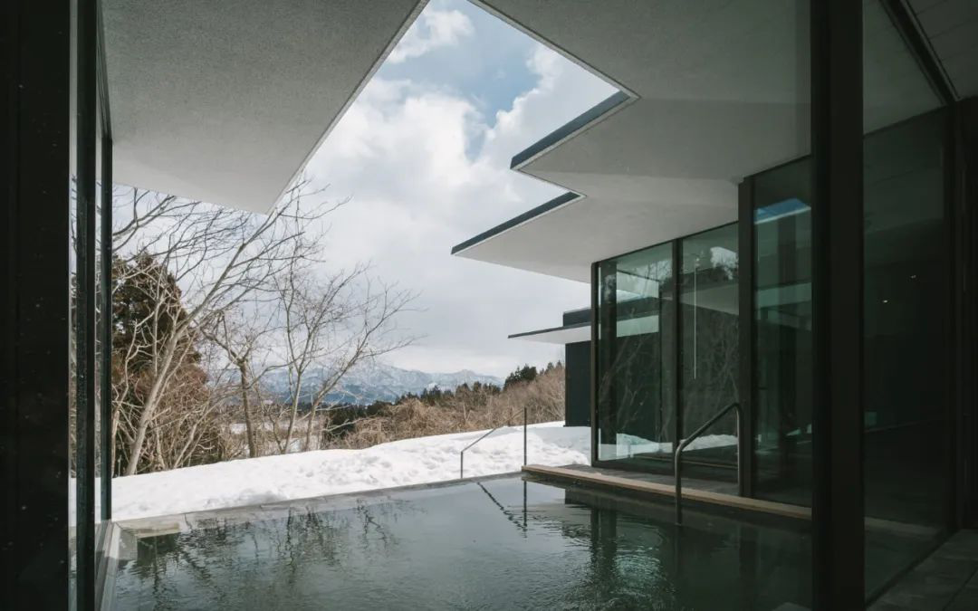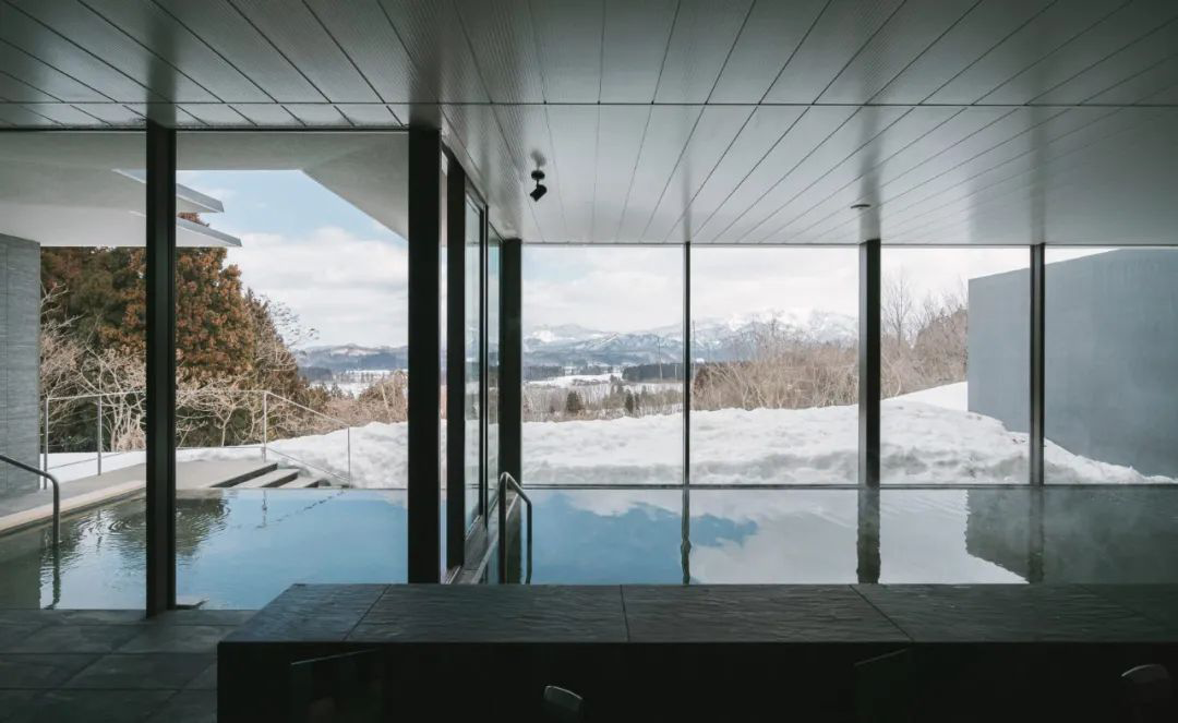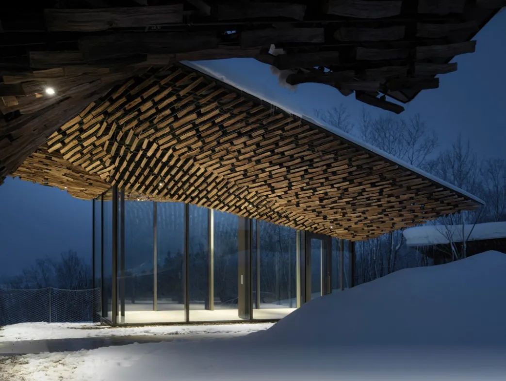 隈研吾为「 Snow Peak」设计的水疗中心直接用木柴做吊顶,室内黑灰色系营造出一种厚重沉稳的基调,冬季与室外纯白色的雪景形成鲜明对比,夏天屋内的木质感则与大自然的朴质感相得益彰。