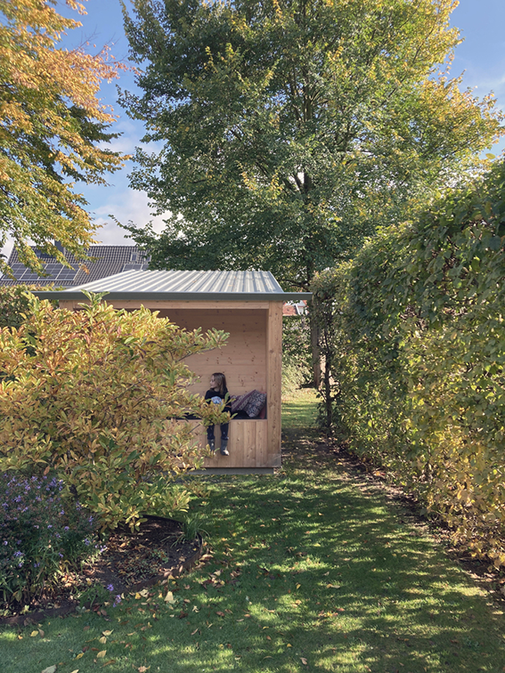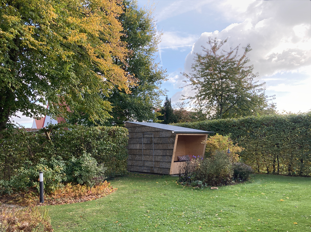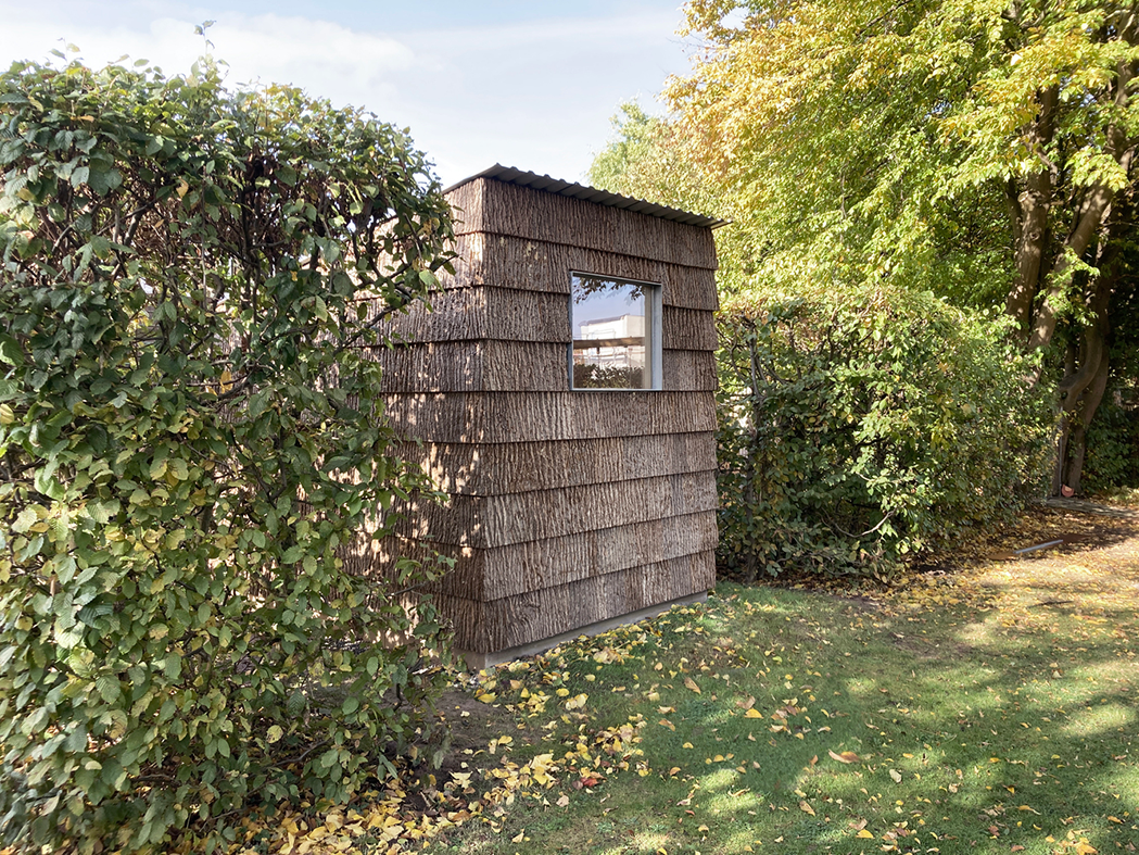 这座热桑拿小屋位于德国汉诺威一间家庭住宅的美丽花园中,周围被毛榉树篱所簇拥所有部件都是预制的,并在现场一天内组装完成
