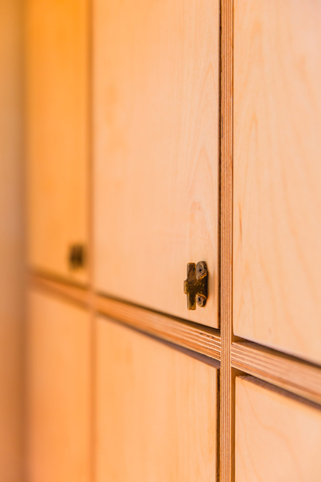 回收的黄铜件被用作更衣室储物柜上的门把手