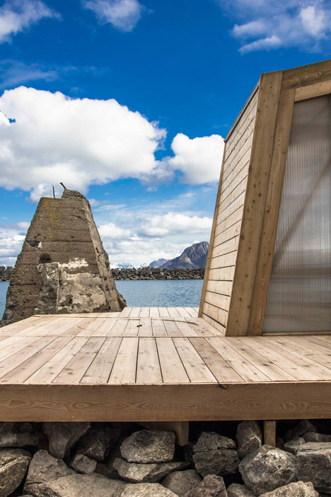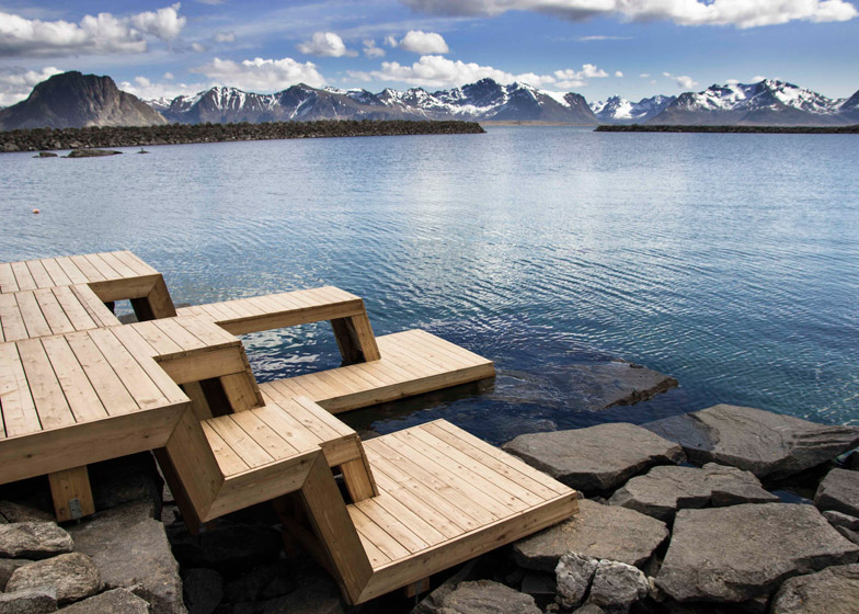 奥斯陆建筑与设计学院的学生设计并建造了一座位于 Lofoten 前渔村码头的海滨桑拿房,由三个在岩石地形上交错排列的木带组成,由桑拿屋、野餐露台和下沉式热水浴缸三个功能组成。
