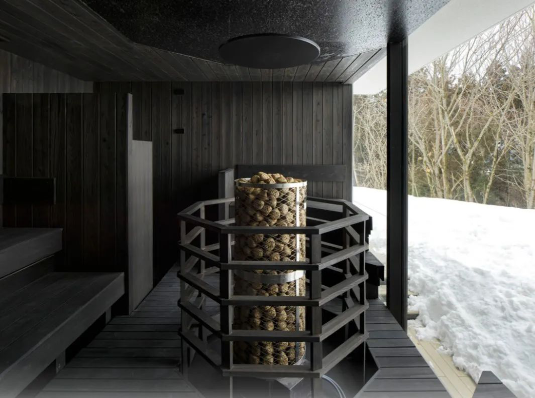 桑拿房在中心位置还设置了 360 度环绕加热器和专为该区域开发定制的具有很高远红外效果的人造石「Kerques Stone」,据说可以温暖使用者的身体核心,享受像篝火包围的感觉。