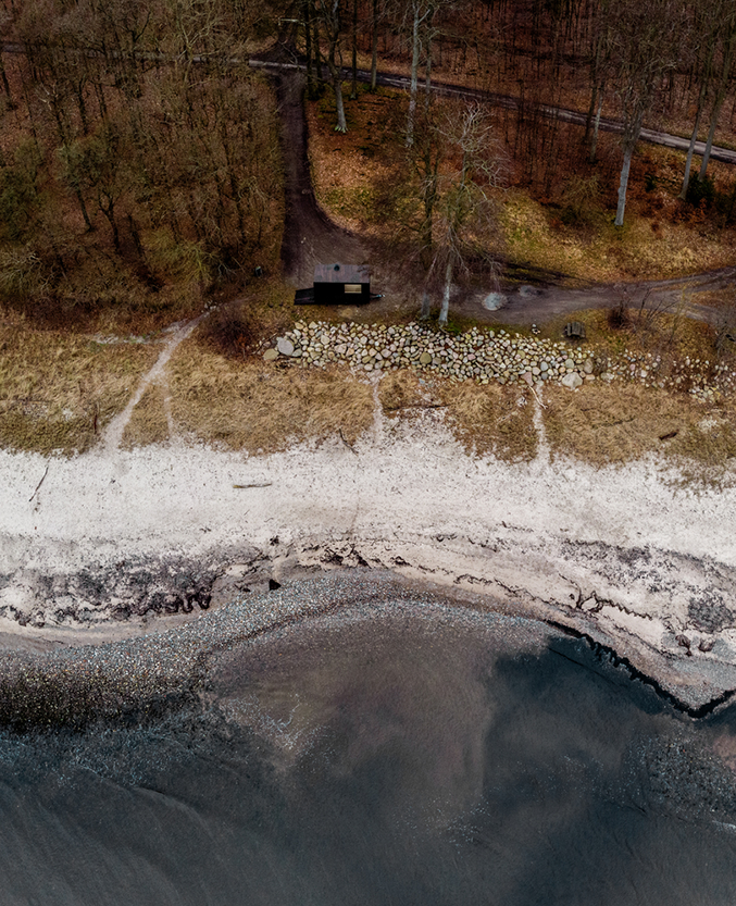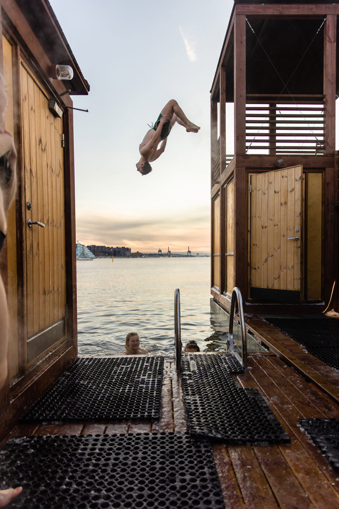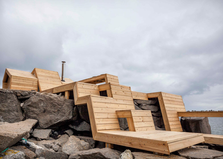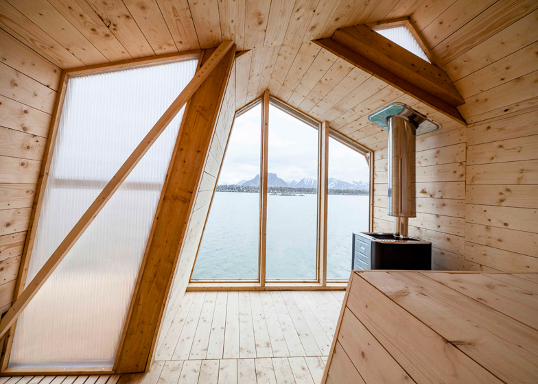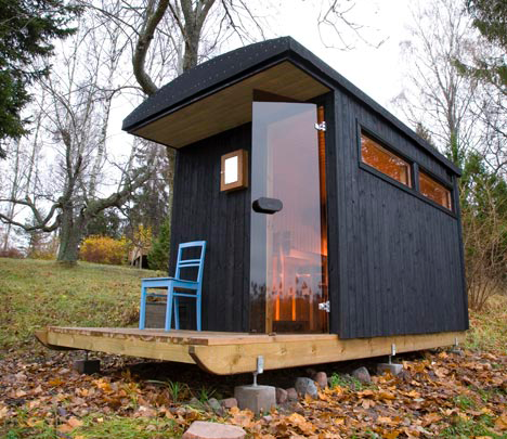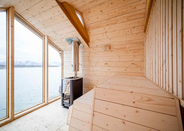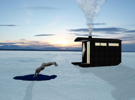 在寒冷的冬季,这个位于芬兰岛屿上的木制桑拿房可以像雪橇一样被用户拖过冰冻的湖面,以找到适合跳水的位置,在陆地上时也可通过可拆卸的混凝土支脚将建筑物固定在地面上。