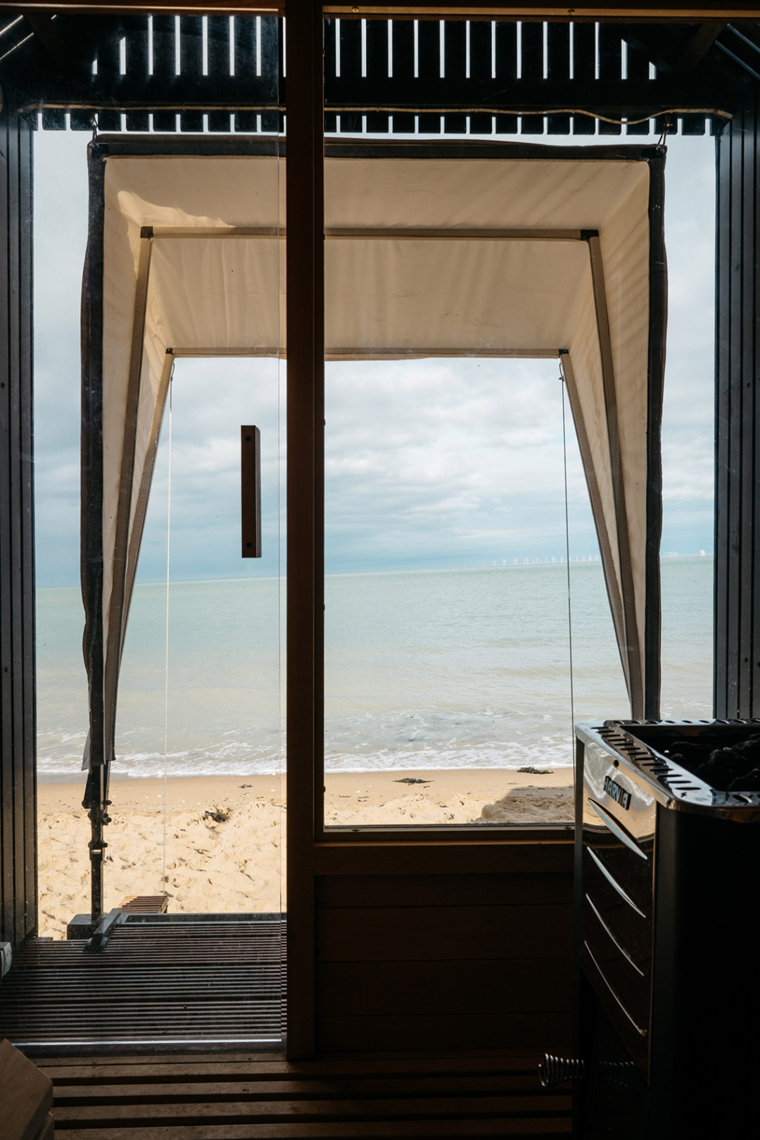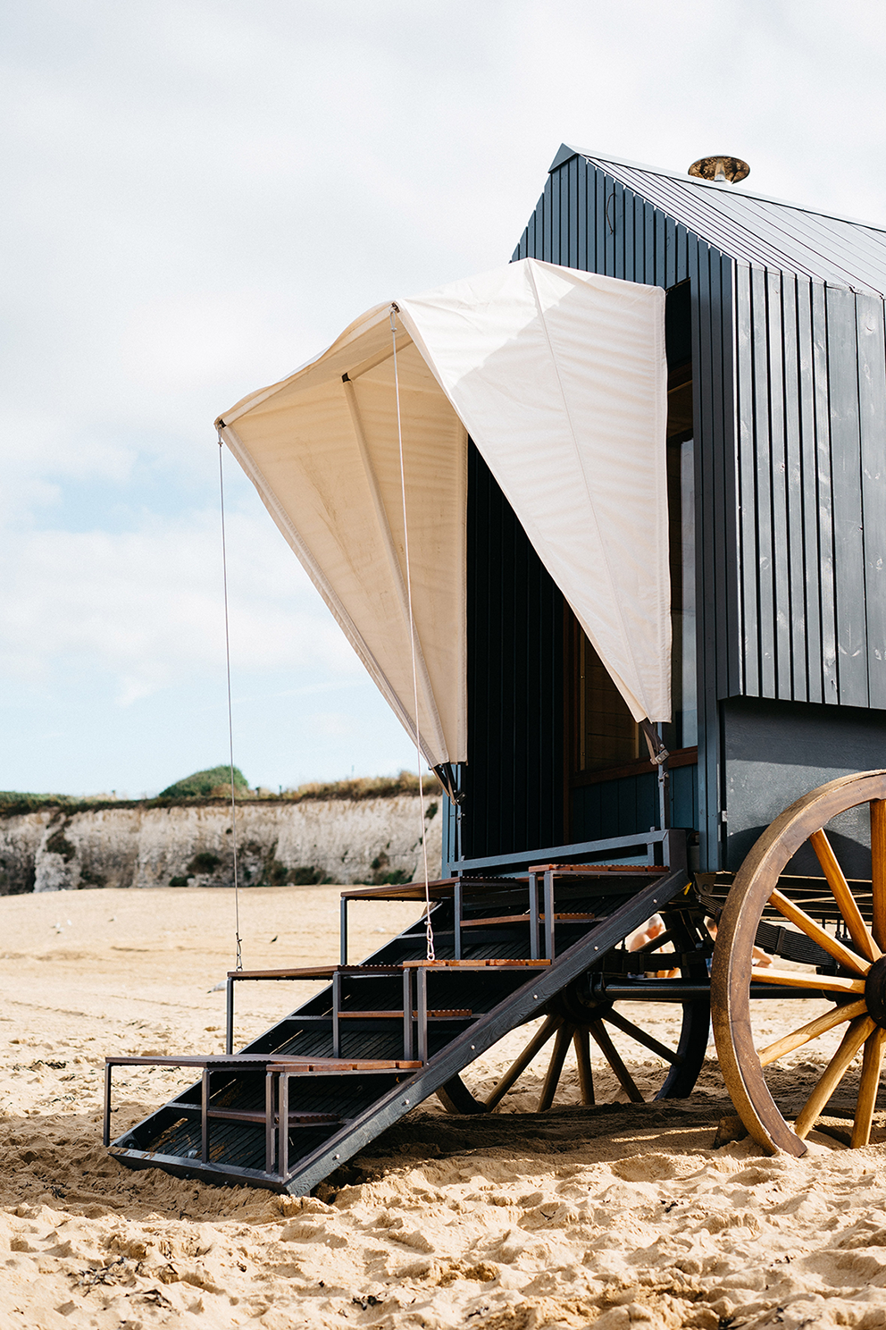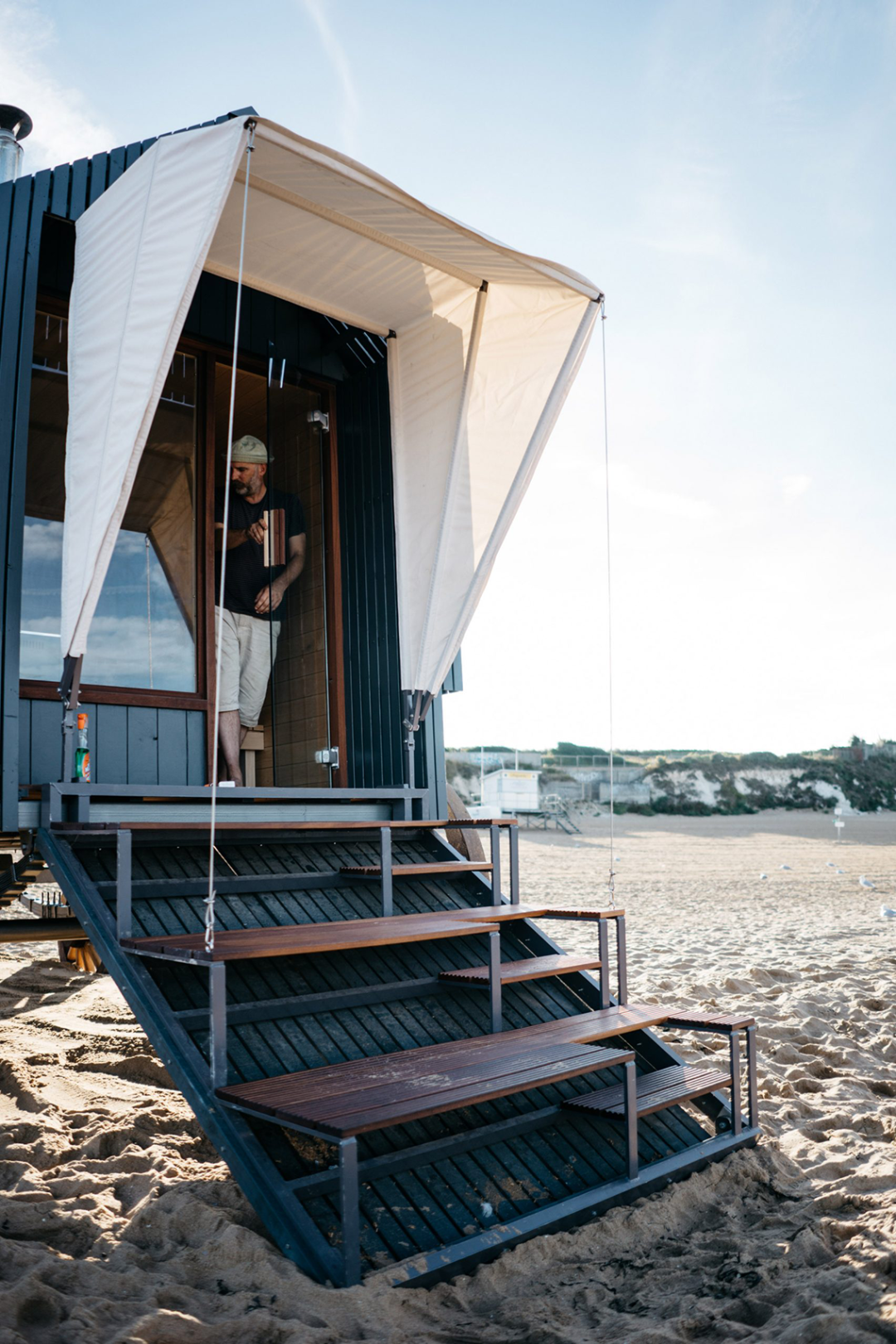 护肤品牌 Haeckels 在马盖特沙滩上建造了一个钢架下装有橡木轮的燃木桑拿房,它有一个可以开合的打蜡布遮阳篷和可折叠成门的台阶,根据需求可移动位置。