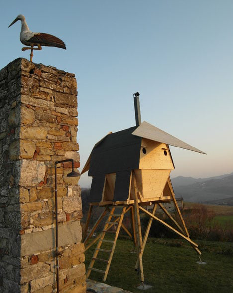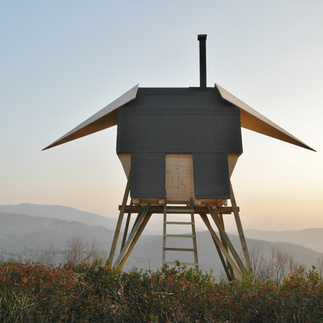 米兰工作室 AtelierFORTE 在意大利北部乡村建造了一个桑拿浴室,其翅膀张开的形式灵感来源于北欧神话乌鸦使者 Huginn 和 Muninn ,采用杉木建造,由柴火炉提供动力,可容纳两人。