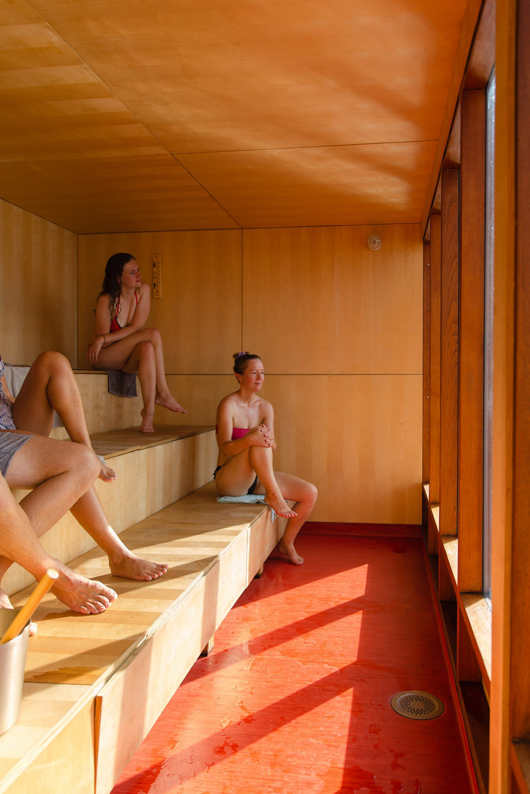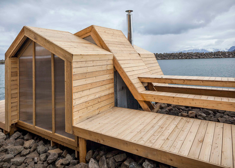 15㎡的三座桑拿屋具有三种不同的人字形屋顶,其与码头上现有的三座建筑在形式上相互呼应。