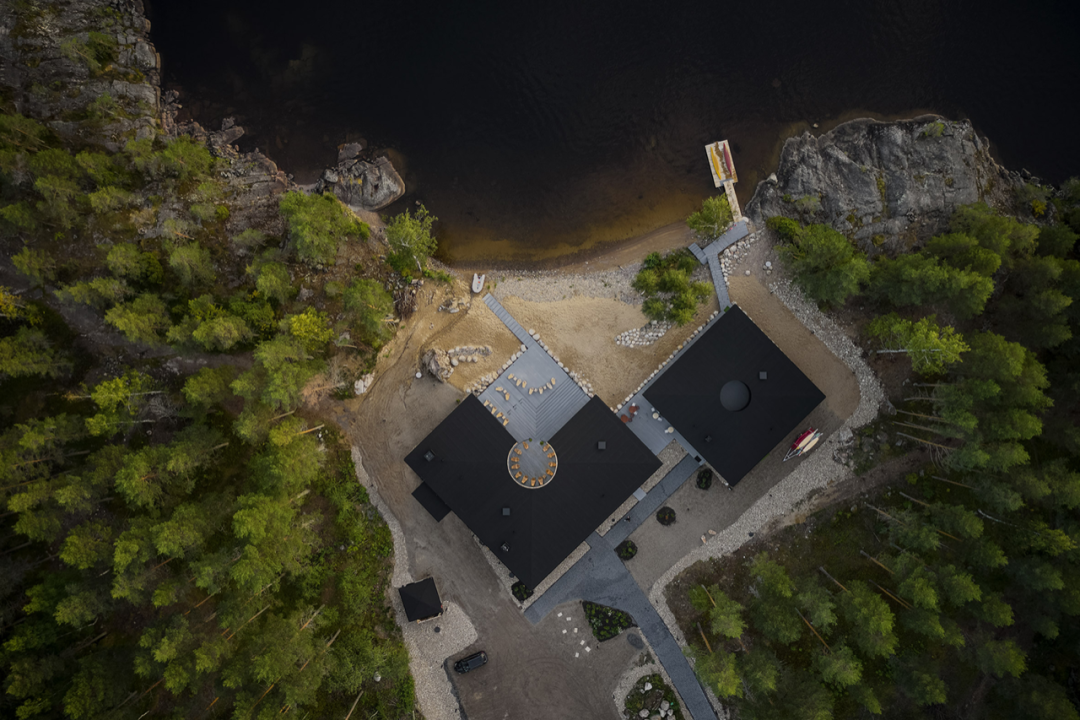 坐落在树木环绕的宁静岩石海湾边,由两座方形建筑组成,内设餐厅和桑拿浴室,餐厅的露天开放式木平台朝向湖面,桑拿房一侧则选用较为私密的带顶露台。
