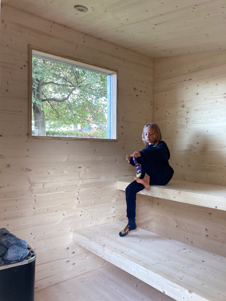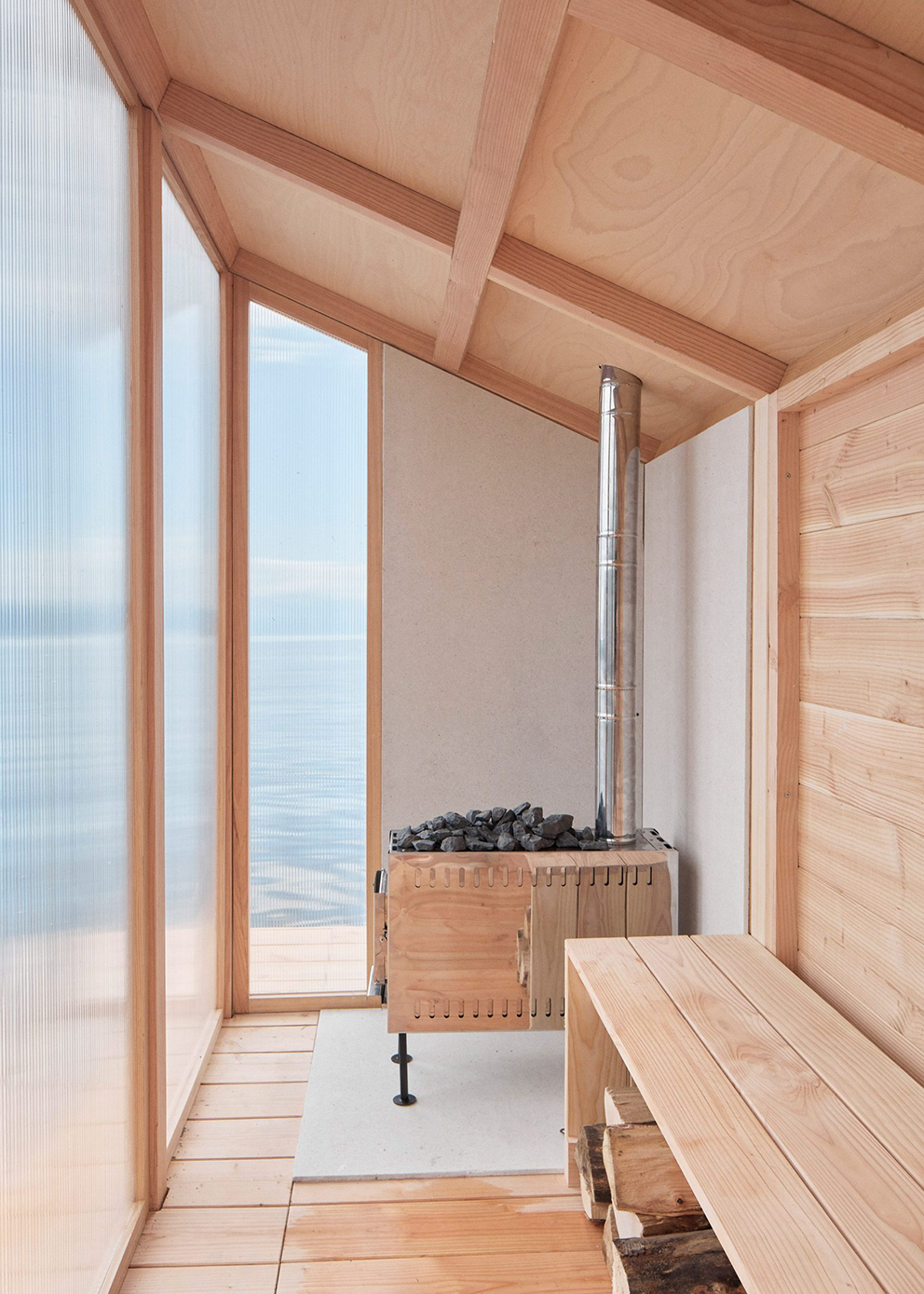 设计团队使用落叶松材来构建桑拿屋及露台的框架与表面,门窗除采用玻璃材质外,也使用了半透明的聚碳酸酯塑料。