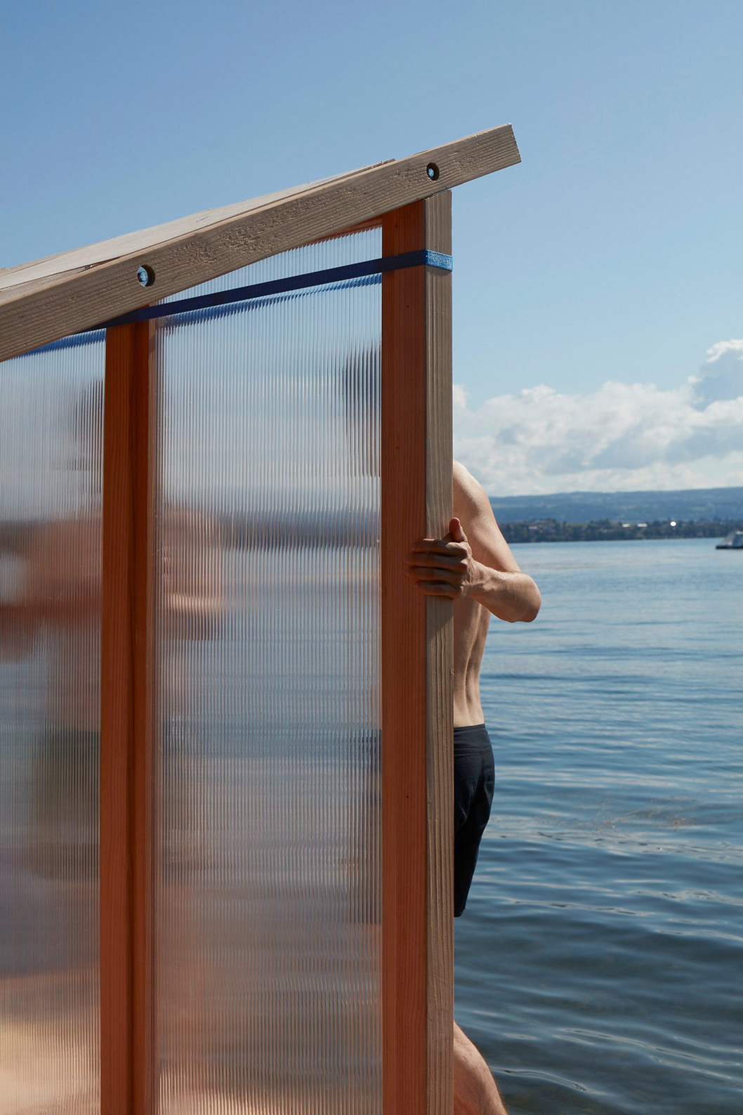 洛桑艺术与设计大学毕业生 Trolle Rudebeck Haar使用当地木材建造了一个预制的漂浮桑拿浴室 Löyly ,占地仅2.2平方米,最多可容纳三人。