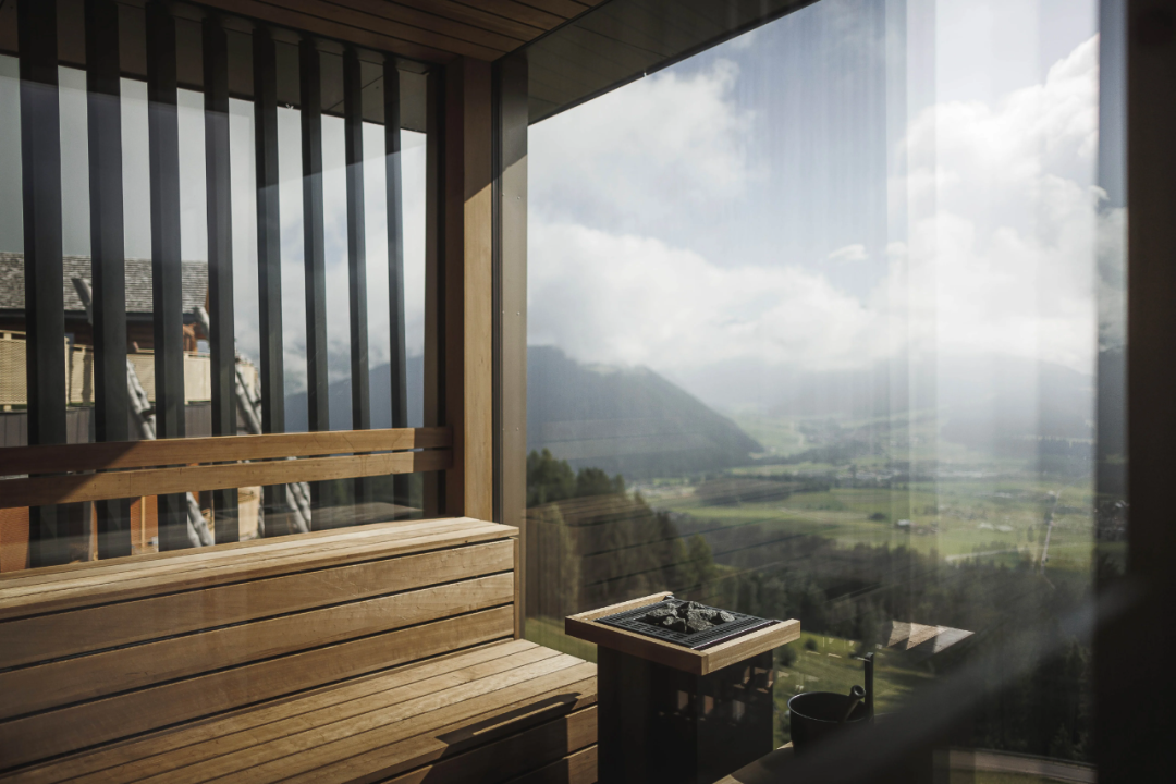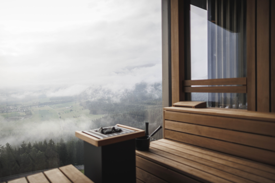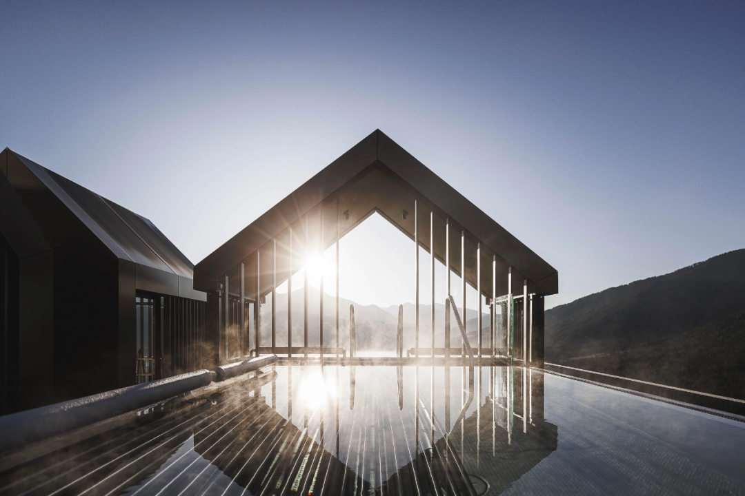 桑拿区配有开放式露天浴池和室内浴池,为了获得与自然的一体感,采用全景玻璃窗,还设有露台,游客透过大片落地窗让目之所及皆是山河风光。
