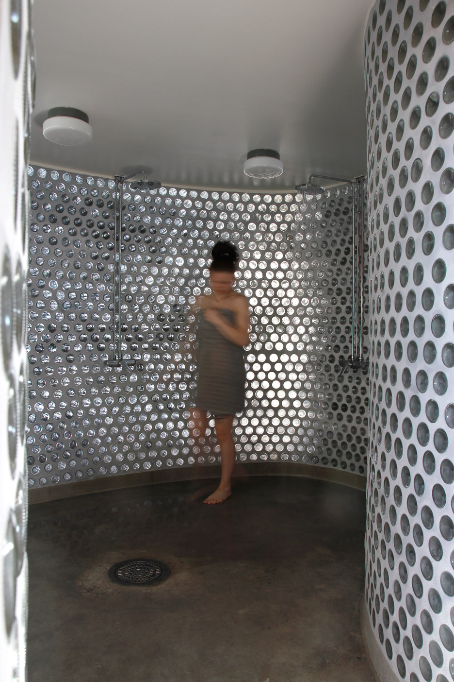 淋浴房内嵌入墙壁的玻璃酒瓶