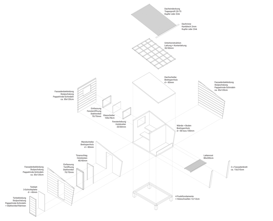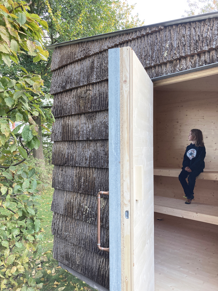 该结构完全由交叉层压木材制成,切成水平条纹的耐用白杨树皮覆盖整个立面,赋予小屋非常自然的外观。