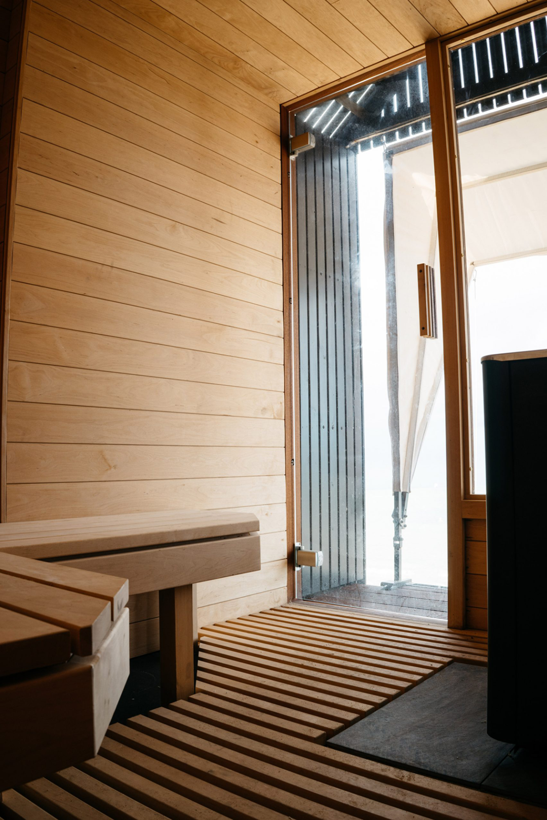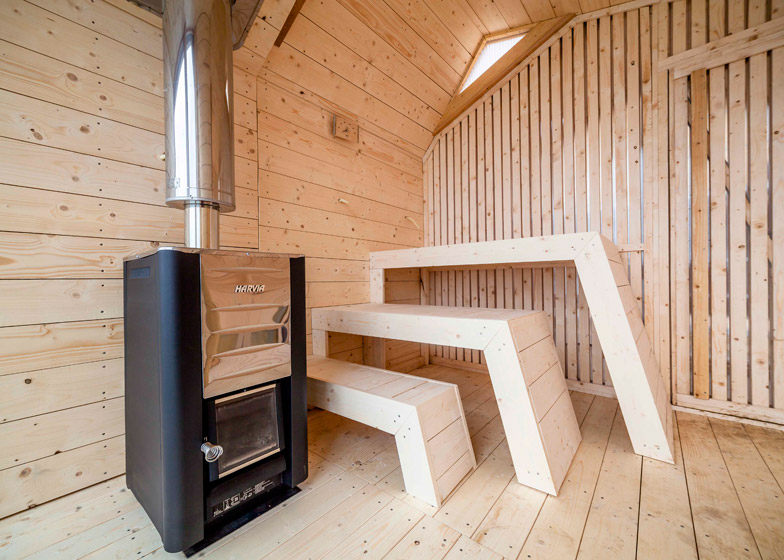 在内部,松木覆盖的内部环绕着一个手工制作的独特燃木燃烧器,炉子里装满了大石头来传导热量,由白杨木制成的分层长椅,最多可容纳 8 人。