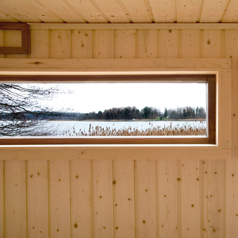 Small Architecture Workshop在瑞典奥莫特湖边为一对比利时夫妇建造了一座漂浮桑拿浴室,黑色外立面和一扇俯瞰湖泊的大窗户是其最大的特点。